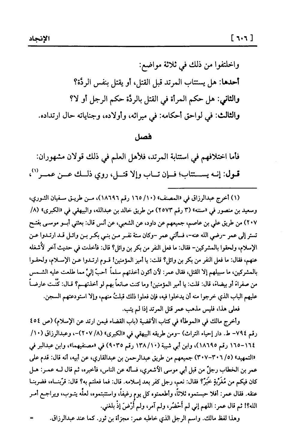 (¬1) أخرج عبد الرزاق في «المصنف» (10/165 رقم 18696) ، من طريق سفيان الثوري، وسعيد بن منصور في «سننه» (3 رقم 2573) من طريق خالد بن عبد الله، والبيهقي في «الكبرى» (8/ 207) من طريق علي بن عاصم، جميعهم عن داود، عن الشعبي، عن أنس قال: بعثني أبو موسى بفتح تستر إلى عمر -رضي الله عنه-، فسألني عمر -وكان ستة نفر من بني بكر بن وائل قد ارتدوا عن الإسلام، ولحقوا بالمشركين- فقال: ما فعل النفر من بكر بن وائل؟ قال: فأخذت في حديث آخر لأُشغله عنهم، فقال: ما فعل النفر من بكر بن وائل؟ قلت: يا أمير المؤمنين! قوم ارتدوا عن الإسلام، ولحقوا بالمشركين، ما سبيلهم إلا القتل، فقال عمر: لأن أكون أخذتهم سلماً أحبّ إليَّ مما طلعت عليه الشمس من صفراءَ أو بيضاءَ، قال: قلت: يا أمير المؤمنين! وما كنت صانعاً بهم لو أخذتهم؟ قال: كُنْت عارضاً عليهم الباب الذي خرجوا منه أن يدخلوا فيه، فإن فعلوا ذلك قبلتُ منهم، وإلا استودعتهم السجن.