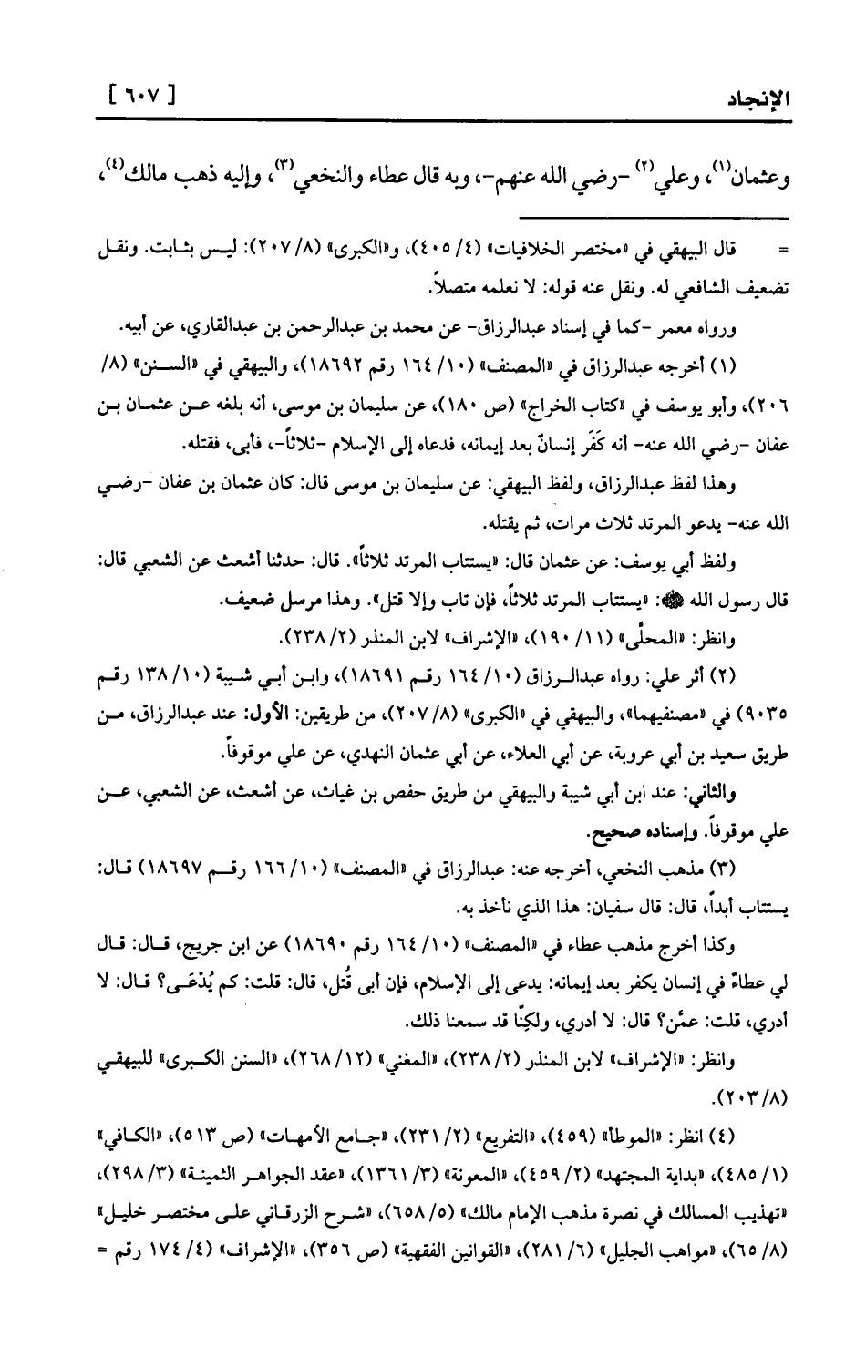 (¬1) أخرجه عبد الرزاق في «المصنف» (10/164 رقم 18692) ، والبيهقي في «السنن» (8/ 206) ، وأبو يوسف في «كتاب الخراج» (ص 180) ، عن سليمان بن موسى، أنه بلغه عن عثمان بن عفان -رضي الله عنه- أنه كَفَر إنسانٌ بعد إيمانه، فدعاه إلى الإسلام -ثلاثاً-، فأبى، فقتله.