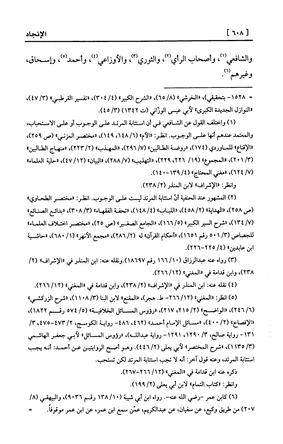 (¬2) المشهور عند الحنفية أنّ استتابة المرتد ليست على الوجوب. انظر: «مختصر الطحاوي» (ص 258) ، «الهداية» (2/458) ، «اللباب» (4/148) ، «تحفة الفقهاء» (3/308) ، «بدائع الصنائع» (7/134) ، «شرح السير الكبير» (5/166) ، «الجامع الصغير» (ص 25) ، «مختصر اختلاف العلماء» للجصاص (3/501 رقم 1651) ، «أحكام القرآن» له (2/286) ، «مجمع الأنهر» (1/680) ، «حاشية ابن عابدين» (4/225-226) .