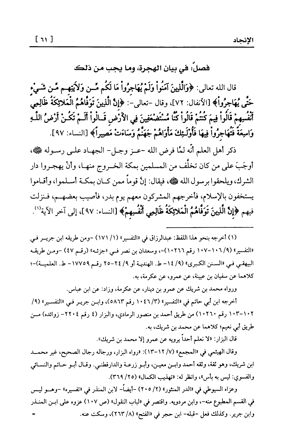 ذكر أهل العلم أنّه لمَّا فرض الله -عز وجل- الجهاد على رسوله - صلى الله عليه وسلم -، أوجَبَ على من كان تخلَّف من المسلمين بمكة الخروج منها، وأنْ يهجروا دار الشرك، ويلحقوا برسول الله - صلى الله عليه وسلم -، فيقال: إنَّ قوماً ممن كان بمكة أسلموا، وأقاموا يستخفون بالإسلام، فأخرجهم المشركون معهم يوم بدر، فأصيب بعضهم، فنزلت فيهم {إِنَّ الَّذِينَ تَوَفَّاهُمُ الْمَلائِكَةُ ظَالِمِي أَنْفُسِهِمْ} [النساء: 97] ، إلى آخر الآية (¬1) .