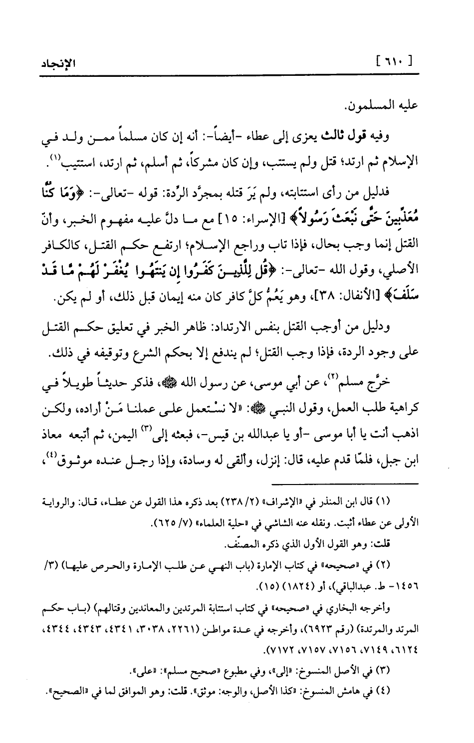 فدليل من رأى استتابته، ولم يَرَ قتله بمجرَّد الرِّدة: قوله -تعالى-: {وَمَا كُنَّا مُعَذِّبِينَ حَتَّى نَبْعَثَ رَسُولاً} [الإسراء: 15] مع ما دلَّ عليه مفهوم الخبر، وأنّ القتل إنما وجب بحال، فإذا تاب وراجع الإسلام؛ ارتفع حكم القتل، كالكافر الأصلي، وقول الله -تعالى-: {قُل لِلَّذِينَ كَفَرُوا إِن يَنتَهُوا يُغْفَرْ لَهُمْ مَّا قَدْ سَلَفَ} [الأنفال: 38] ، وهو يَعُمُّ