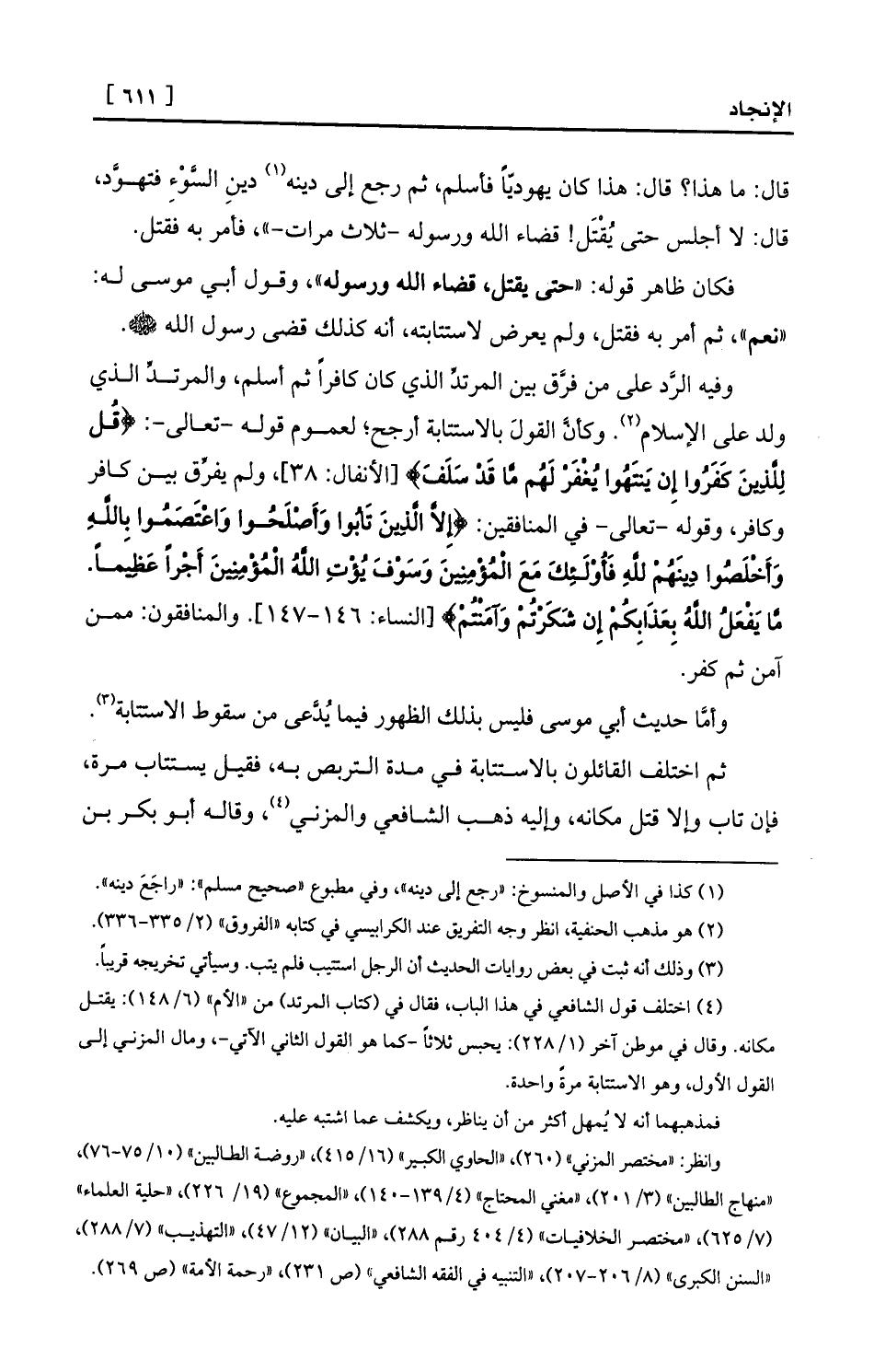 (¬4) اختلف قول الشافعي في هذا الباب، فقال في (كتاب المرتد) من «الأم» (6/148) : يقتل مكانه. وقال في موطن آخر (1/228) : يحبس ثلاثاً -كما هو القول الثاني الآتي-، ومال المزني إلى القول الأول، وهو الاستتابة مرةً واحدة.
