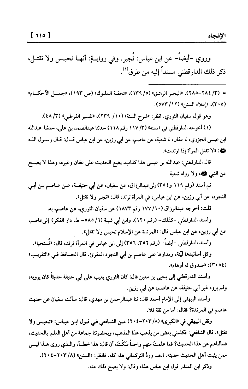 ثم أسند (رقم 119 و354) إلىعبد الرزاق، عن سفيان، عن أبي حنيفة، عن عاصم بن أبي النجود، عن أبي رزين، عن ابن عباس، في المرأة ترتد، قال: «تجبر ولا تقتل» .