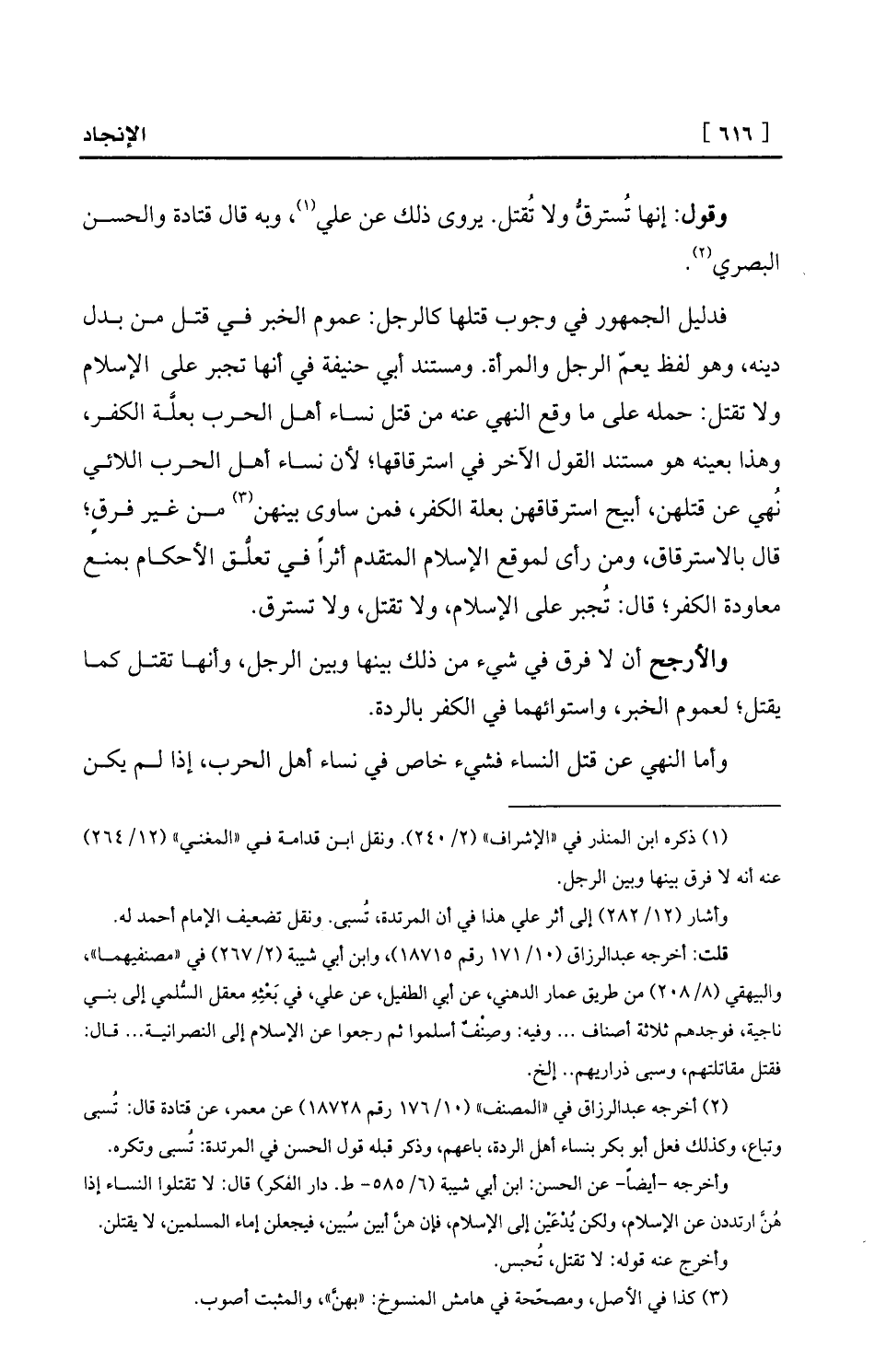 وأخرجه -أيضاً- عن الحسن: ابن أبي شيبة (6/585- ط. دار الفكر) قال: لا تقتلوا النساء إذا هُنَّ ارتددن عن الإسلام، ولكن يُدْعَيْن إلى الإسلام، فإن هنَّ أبين سُبين، فيجعلن إماء المسلمين، لا يقتلن.