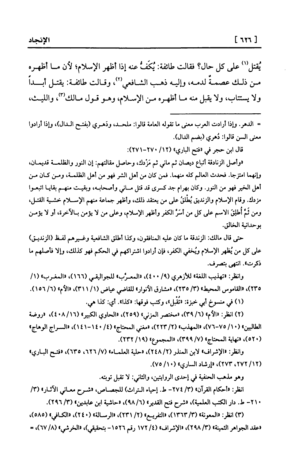 حتى قال مالك: الزندقة ما كان عليه المنافقون، وكذا أطلق الشافعية وغيرهم لفظ (الزنديق) على كل من يُظهر الإسلام ويُخفي الكفر، فإن أرادوا اشتراكهم في الحكم فهو كذلك، وإلا فأصلهم ما ذكرت» . انتهى بتصرف.