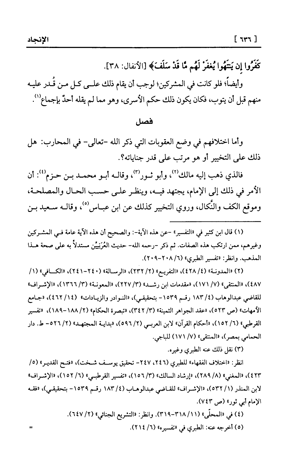 فالذي ذهب إليه مالك (¬2) ، وأبو ثور (¬3) ، وقاله أبو محمد بن حزم (¬4) : أن الأمر في ذلك إلى الإمام، يجتهد فيه، وينظر على حسب الحال والمصلحة، وموقع الكف والنَّكال، وروي التخيير كذلك عن ابن عباس (¬5) ، وقاله سعيد بن