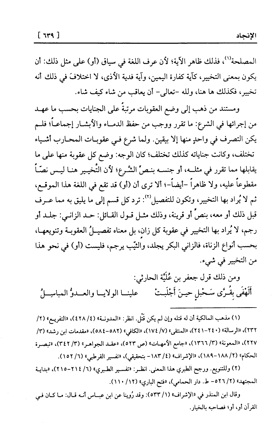 ومستند من ذهب إلى وضع العقوبات مرتبةً على الجنايات بحسب ما عهد من إجرائها في الشرع: ما تقرر ووجب من حفظ الدماء والأبشار إجماعاً؛ فلم يكن التصرف في واحدٍ منها إلا بيقين. ولما شرع في عقوبات المحارب أشياء تختلف، وكانت جناياته كذلك تختلف؛ كان الوجه: وضع كل عقوبة منها على ما يقابلها مما تقرر في مثله، أو جنسه بنصِّ الشَّرع؛ لأن التَّخيير هنا ليس نصّاً مقطوعاً عليه، ولا ظاهراً -أيضاً-؛ ألا ترى أن (أو) قد تقع في اللغة هذا الموقع، ثم لا يُراد بها التخيير، وتكون للتفصيل (¬2) : ترد كل قسم إلى ما يليق به مما عرف قبل ذلك أو معه، بنصٍّ أو قرينة، وذلك مثل قول القائل: حد الزاني: جلد أو رجم، لا يُراد بها التخيير في عقوبة كل زانٍ، بل معناه تفصيلُ العقوبة وتنويعها، بحسب أنواع الزناة، فالزاني البكر يجلد، والثيّب يرجم، فليست (أو) في نحو هذا من التخيير في شيء.