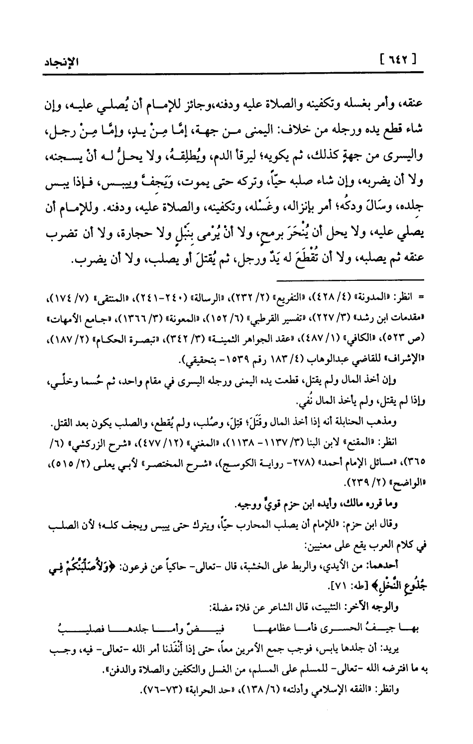 عنقه، وأمر بغسله وتكفينه والصلاة عليه ودفنه، وجائز للإمام أن يُصلي عليه، وإن شاء قطع يده ورجله من خلاف: اليمنى من جهة، إمَّا مِنْ يدٍ، وإمَّا مِنْ رجل، واليسرى من جهةٍ كذلك، ثم يكويه؛ ليرقأ الدم، ويُطلِقهُ، ولا يحلُّ له أنْ يسجنه، ولا أن يضربه، وإن شاء صلبه حيّاً، وتركه حتى يموت، وَيَجِفَّ وييبس، فإذا يبس جِلده، وسَالَ ودكُه؛ أمر بإنزاله، وغَسْله، وتكفينه، والصلاة عليه، ودفنه. وللإمام أن يصلي عليه، ولا يحل أن يُنْحَرَ برمحٍ، ولا أنْ يُرْمى بِنَبْلٍ ولا حجارة، ولا أن تضرب عنقه ثم يصلبه، ولا أن تُقْطَعَ له يَدٌ ورجل، ثم يُقتلَ أو يصلب، ولا أن يضرب.