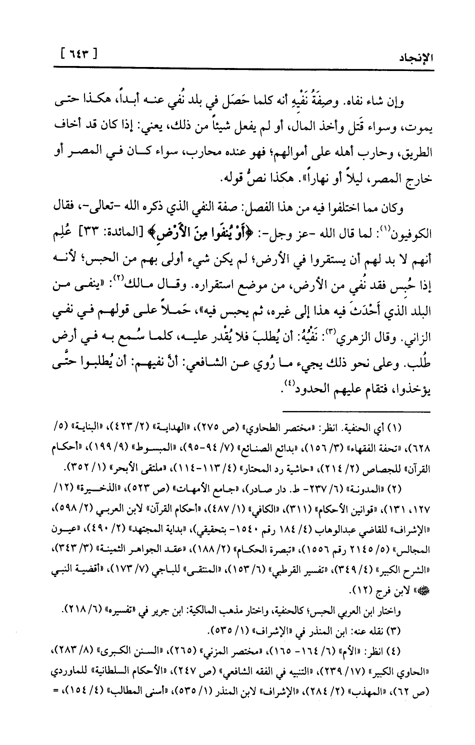 مِنَ الأَرْضِ} [المائدة: 33] عُلِم أنهم لا بد لهم أن يستقروا في الأرض؛ لم يكن شيء أولى بهم من الحبس؛ لأنه إذا حُبِس فقد نُفي من الأرض، من موضع استقراره. وقال مالك (¬2) : «ينفى من البلد الذي أَحْدَثَ فيه هذا إلى غيره، ثم يحبس فيه» ، حَملاً على قولهم في نفي الزاني. وقال الزهري (¬3) : نَفْيُهُ: أن يُطلبَ فلا يُقْدر عليه، كلما سُمع به في أرض طُلب. وعلى نحو ذلك يجيء ما رُوي عن الشافعي: أنَّ نفيهم: أن يُطلبوا حتَّى يؤخذوا، فتقام عليهم الحدود (¬4) .