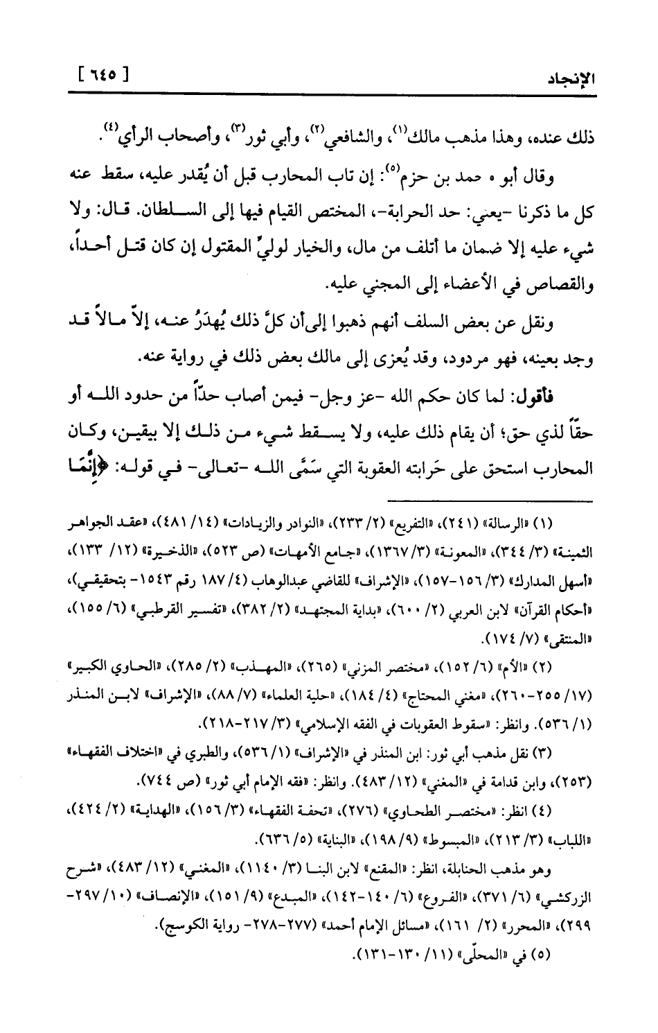 فأقول: لما كان حكم الله -عز وجل- فيمن أصاب حدّاً من حدود الله أو حقّاً لذي حق؛ أن يقام ذلك عليه، ولا يسقط شيء من ذلك إلا بيقين، وكان المحارب استحق على حَرابته العقوبة التي سَمَّى الله -تعالى- في قوله: {إِنَّمَا