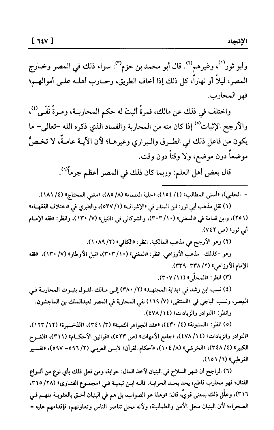 (¬4) نسب ابن رشد في «بداية المجتهد» (2/380) إلى مالك القول بثبوت المحاربة في المِصر، ونسب الباجي في «المنتقى» (7/169) نفي المحاربة في المصر لعبد الملك بن الماجشون.