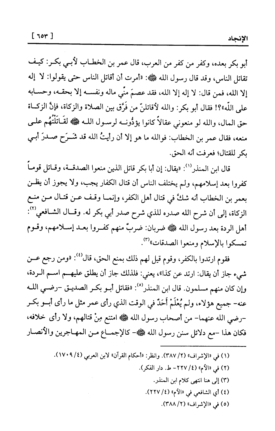قال ابن المنذر (¬1) : «يقال: إن أبا بكر قاتل الذين منعوا الصدقة، وقاتل قوماً كفروا بعد إسلامهم، ولم يختلف الناس أن قتال الكفار يجب، ولا يجوز أن يظن بعمر بن الخطاب أنه شكَّ في قتال أهل الكفر، وإنما وقف عن قتال من منع الزكاة، إلى أن شرح الله صدره للذي شرح صدر أبي بكر له. وقال الشافعي (¬2) : أهل الردة بعد رسول الله - صلى الله عليه وسلم - ضربان: ضربٌ منهم كفروا بعد إسلامهم، وقوم تمسكوا بالإسلام ومنعوا الصدقات» (¬3) .