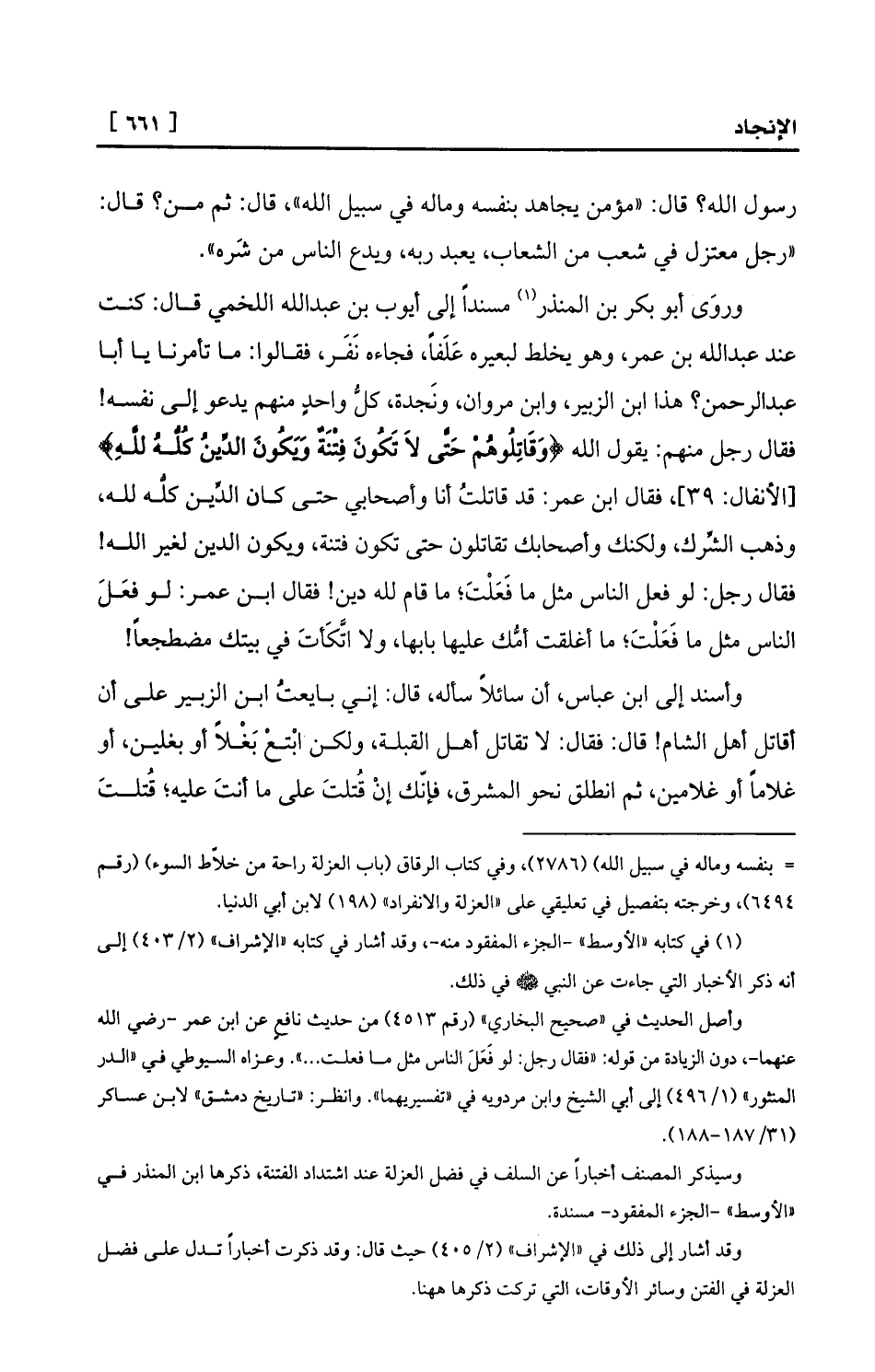 وسيذكر المصنف أخباراً عن السلف في فضل العزلة عند اشتداد الفتنة، ذكرها ابن المنذر في «الأوسط» -الجزء المفقود- مسندة.