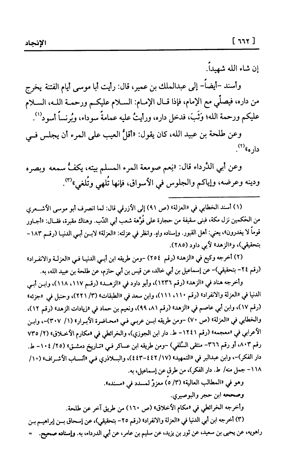 (¬2) أخرجه وكيع في «الزهد» (رقم 254) -ومن طريقه ابن أبي الدنيا في «العزلة والانفراد» (رقم 24- بتحقيقي) - عن إسماعيل بن أبي خالد، عن قيس بن أبي حازم، عن طلحة بن عبيد الله، به.