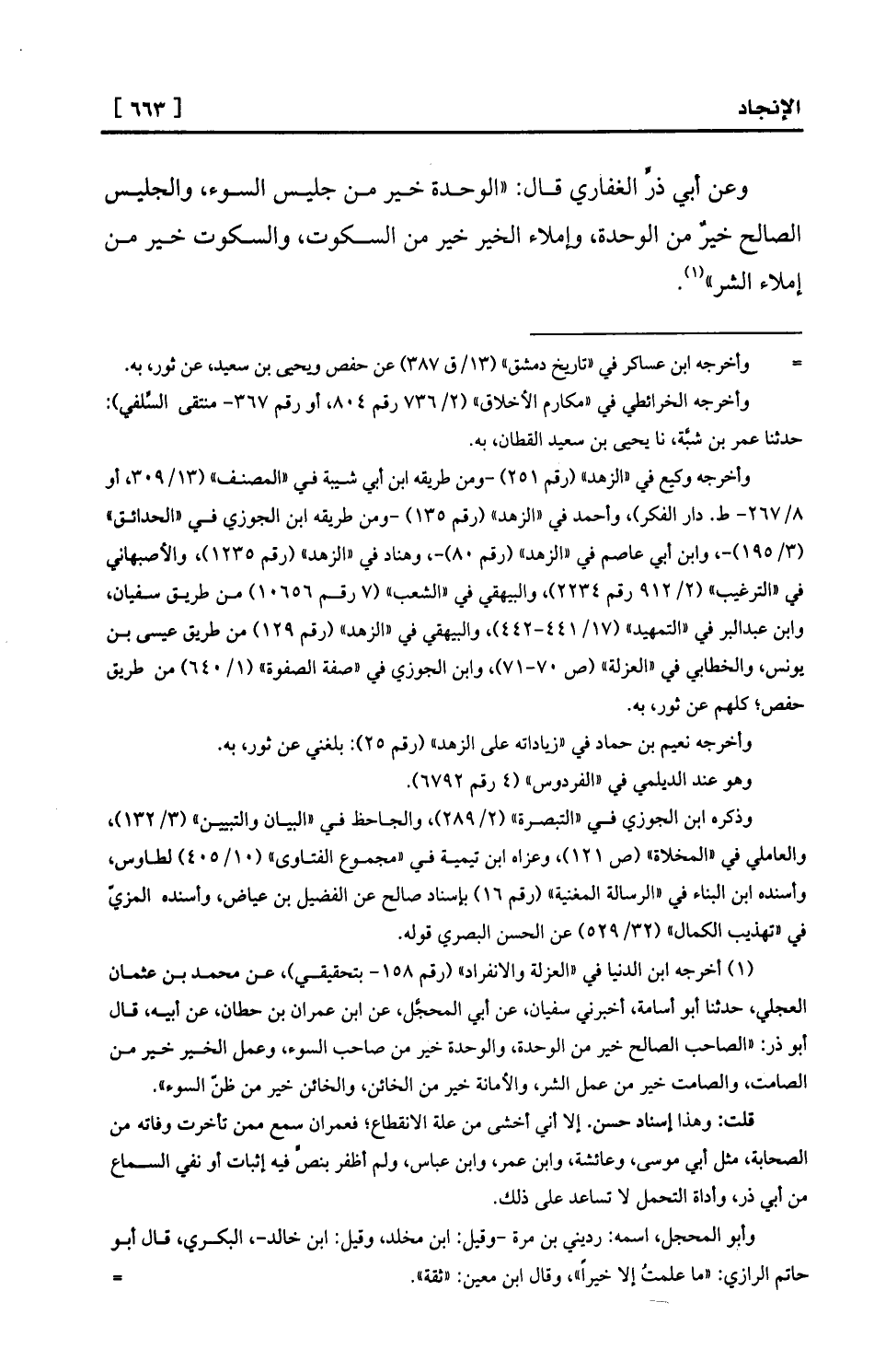 (¬1) أخرجه ابن الدنيا في «العزلة والانفراد» (رقم 158- بتحقيقي) ، عن محمد بن عثمان العجلي، حدثنا أبو أسامة، أخبرني سفيان، عن أبي المحجَّل، عن ابن عمران بن حطان، عن أبيه، قال أبو ذر: «الصاحب الصالح خير من الوحدة، والوحدة خير من صاحب السوء، وعمل الخير خير من الصامت، والصامت خير من عمل الشر، والأمانة خير من الخائن، والخائن خير من ظنّ السوء» .