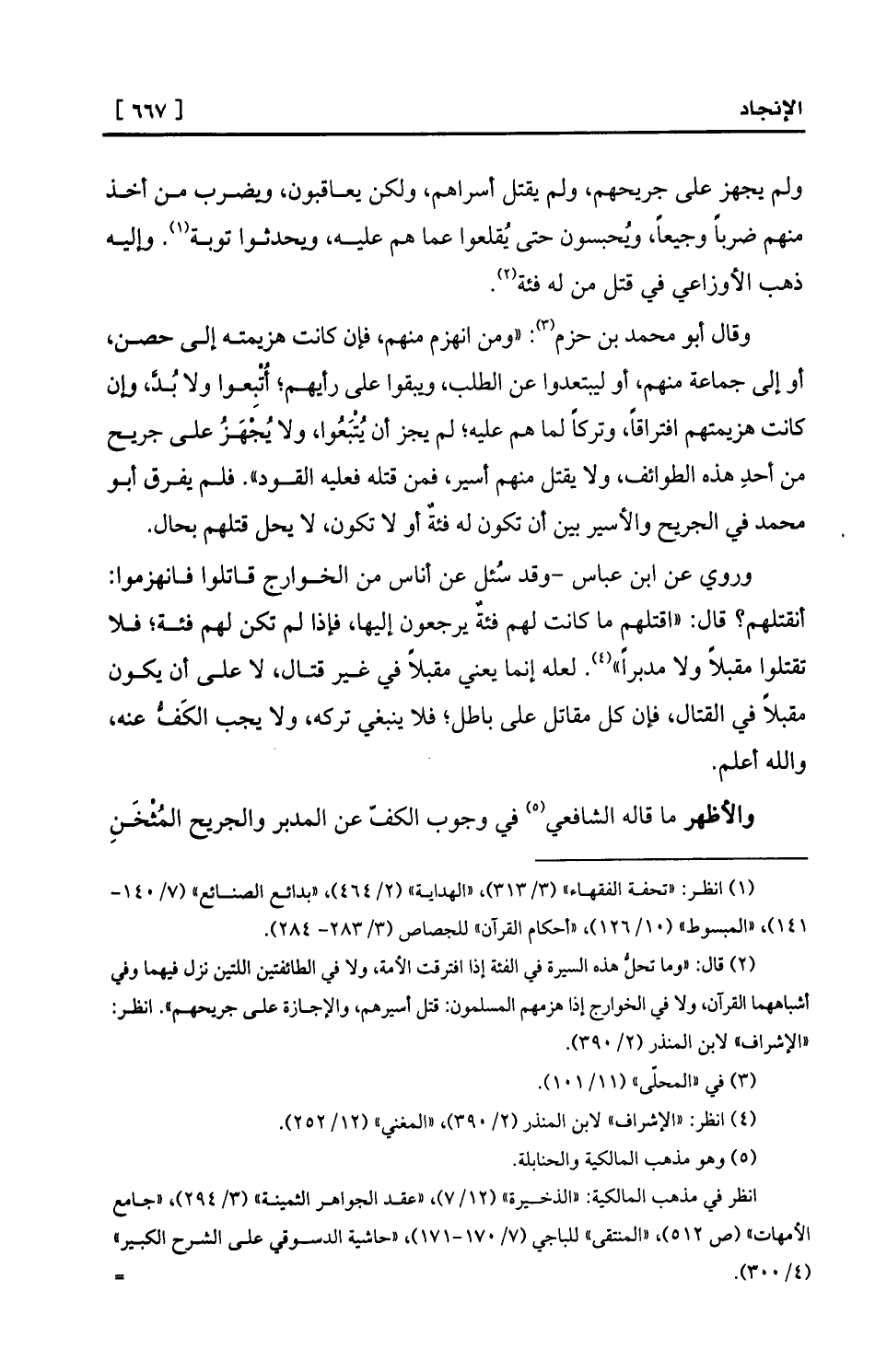 وقال أبو محمد بن حزم (¬3) : «ومن انهزم منهم، فإن كانت هزيمته إلى حصن، أو إلى جماعة منهم، أو ليبتعدوا عن الطلب، ويبقوا على رأيهم؛ أُتْبِعوا ولا بُدَّ، وإن كانت هزيمتهم افتراقاً، وتركاً لما هم عليه؛ لم يجز أن يُتْبَعُوا، ولا يُجْهَزُ على جريح من أحدِ هذه