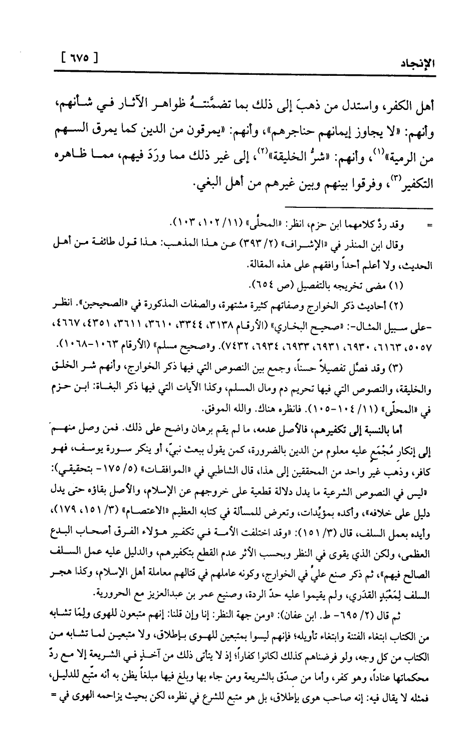 (¬3) وقد فصَّل تفصيلاً حسناً، وجمع بين النصوص التي فيها ذكر الخوارج، وأنهم شر الخلق والخليقة، والنصوص التي فيها تحريم دم ومال المسلم، وكذا الآيات التي فيها ذكر البغاة: ابن حزم في «المحلّى» (11/104-105) . فانظره هناك. والله الموفق.