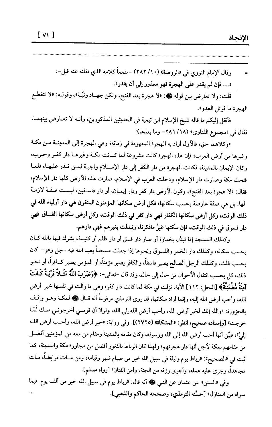 وكذلك المسجد إذا تبدَّل بخمارة أو صار دار فسق أو دار ظلم أو كنيسة، يشرك فيها بالله كان بحسب سكانه، وكذلك دار الخمر والفسوق ونحوها إذا جعلت مسجداً يعبد الله فيه -جل وعز- كان بحسب ذلك، وكذلك الرجل الصالح يصير فاسقاً، والكافر يصير مؤمناً، أو المؤمن يصير كافراً، أو نحو ذلك، كل بحسب انتقال الأحوال من حال إلى حال، وقد قال -تعالى-: {وَضَرَبَ اللَّهُ مَثَلاً قَرْيَةً كَانَتْ آمِنَةً مُّطْمَئِنَّةً} [النحل: 112] الآية، نزلت في مكة لما كانت دار كفر، وهي ما زالت في نفسها خير أرض الله، وأحب أرض الله إليه، وإنما أراد سكانها، قد روى الترمذي مرفوعاً أنه قال - صلى الله عليه وسلم - لمكة وهو واقف بالحزورة: «والله إنك لخير أرض الله، وأحب أرض الله إلى الله، ولولا أن قومي أخرجوني منك لَمَا خرجت» [وإسناده صحيح، انظر: «المشكاة» (2725) ] . وفي رواية: «خير أرض الله، وأحب أرض الله إليَّ» ، فبيَّن أنها أحب أرض الله إلى الله ورسوله، وكان مقامه بالمدينة ومقام من معه من المؤمنين أفضل من مقامهم بمكة لأجل أنها دار هجرتهم؛ ولهذا كان الرباط بالثغور أفضل من مجاورة مكة والمدينة، كما ثبت في «الصحيح» : «رباط يوم وليلة في سبيل الله خير من صيام شهر وقيامه، ومن مات مرابطاً، مات مجاهداً، وجرى عليه عمله، وأجرى رزقه من الجنة، وأمن الفتان» [رواه مسلم] .