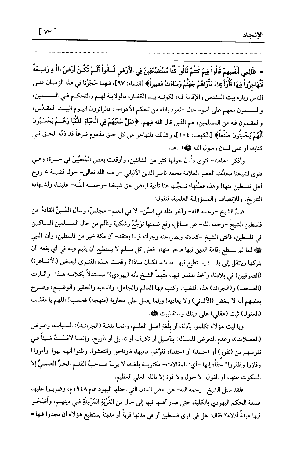 فلقد سئل الشيخ -رحمه الله- عن بعض المدن التي احتلها اليهود عام 1948م، وضربوا عليها صبغة الحكم اليهودي بالكلية، حتى صار أهلها فيها إلى حال من الغُرْبَةِ المُرْمِلَةِ في دينهم، وأَضْحَوا فيها عبدةً أذلاء؟ فقال: هل في قرى فلسطين أو في مدنها قريةٌ أو مدينةٌ يستطيع هؤلاء أن يجدوا فيها =