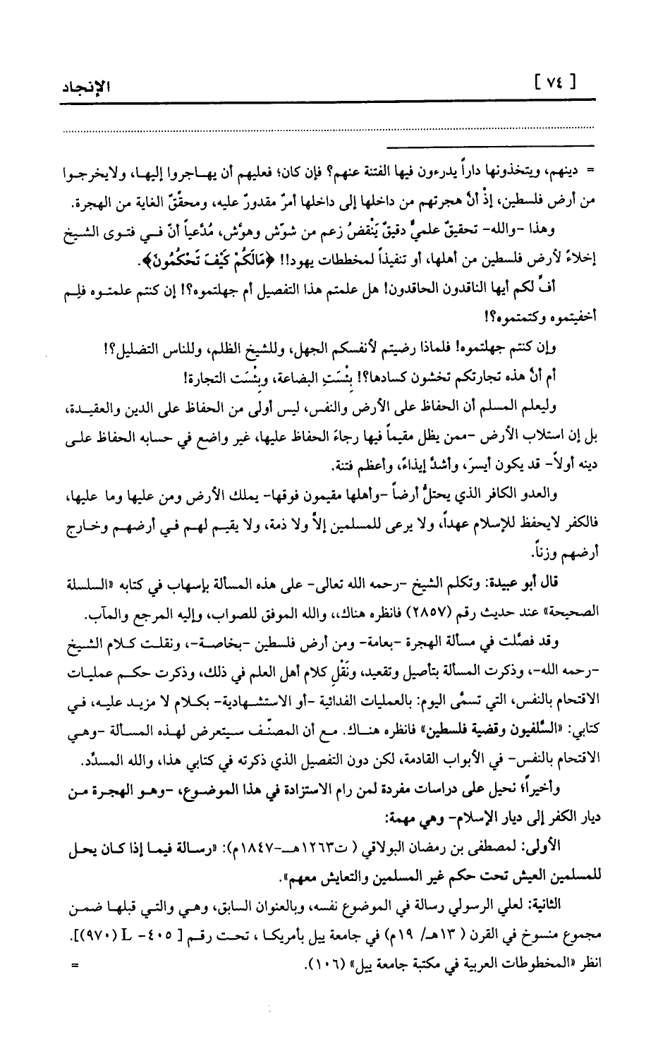 وهذا -والله- تحقيقٌ علميٌّ دقيقٌ يَنْقضُ زعم من شوّش وهوَّش، مُدَّعياً أنّ في فتوى الشيخ إخلاءً لأرض فلسطين من أهلها، أو تنفيذاً لمخططات يهود!! {مَالَكُمْ كَيْفَ تَحْكُمُونَ} .