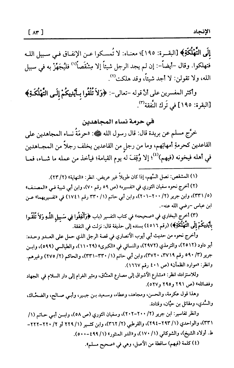 (¬3) أخرج البخاري في «صحيحه» في كتاب التفسير (باب {وَأَنْفِقُوا فِي سَبِيلِ اللَّهِ وَلاَ تُلْقُوا بِأَيْدِيكُمْ إِلَى التَّهْلُكَةِ} ) (رقم 4516) بسنده إلى حذيفة قال: نزلت في النفقة.