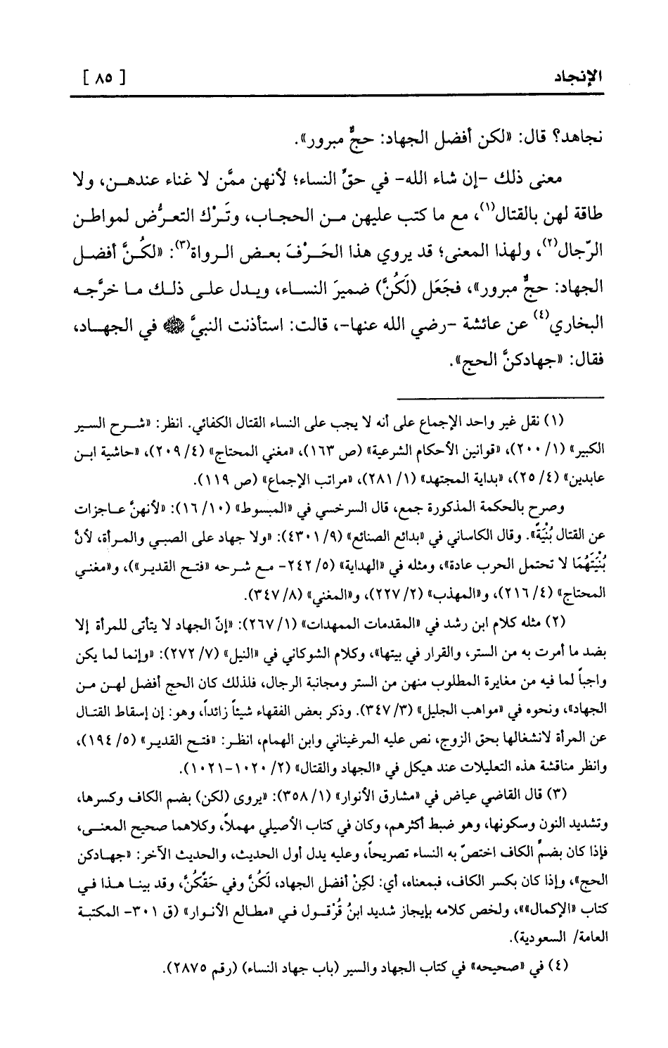 (¬3) قال القاضي عياض في «مشارق الأنوار» (1/358) : «يروى (لكن) بضم الكاف وكسرها، وتشديد النون وسكونها، وهو ضبط أكثرهم، وكان في كتاب الأصيلي مهملاً، وكلاهما صحيح المعنى، فإذا كان بضمٍّ الكاف اختصّ به النساء تصريحاً، وعليه يدل أول الحديث، والحديث الآخر: «جهادكن الحج» ، وإذا كان بكسر الكاف، فبمعناه، أي: لكِنْ أفضل الجهاد، لَكُنَّ وفي حَقِّكُنَّ، وقد بينا هذا في كتاب «الإكمال» » ، ولخص كلامه بإيجاز شديد ابنُ قُرْقول في «مطالع الأنوار» (ق 301- المكتبة العامة/ السعودية) .
