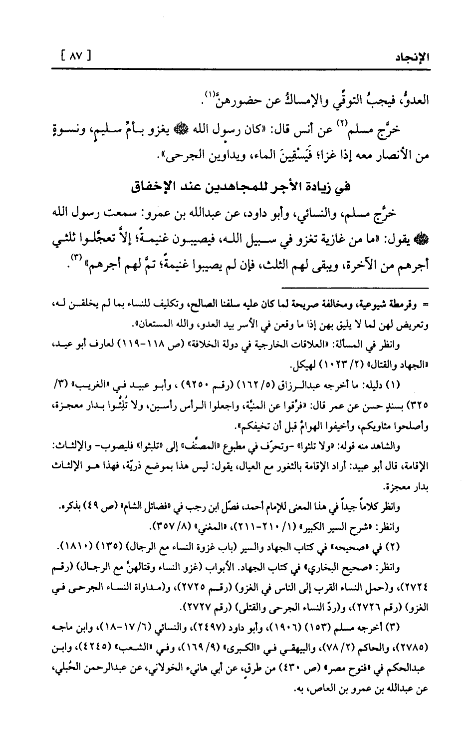 وانظر: «صحيح البخاري» في كتاب الجهاد. الأبواب (غزو النساء وقتالهنَّ مع الرجال) (رقم 2724) ، و (حمل النساء القرب إلى الناس في الغزو) (رقم 2725) ، و (مداواة النساء الجرحى في الغزو) (رقم 2726) ، و (ردّ النساء الجرحى والقتلى) (رقم 2727) .