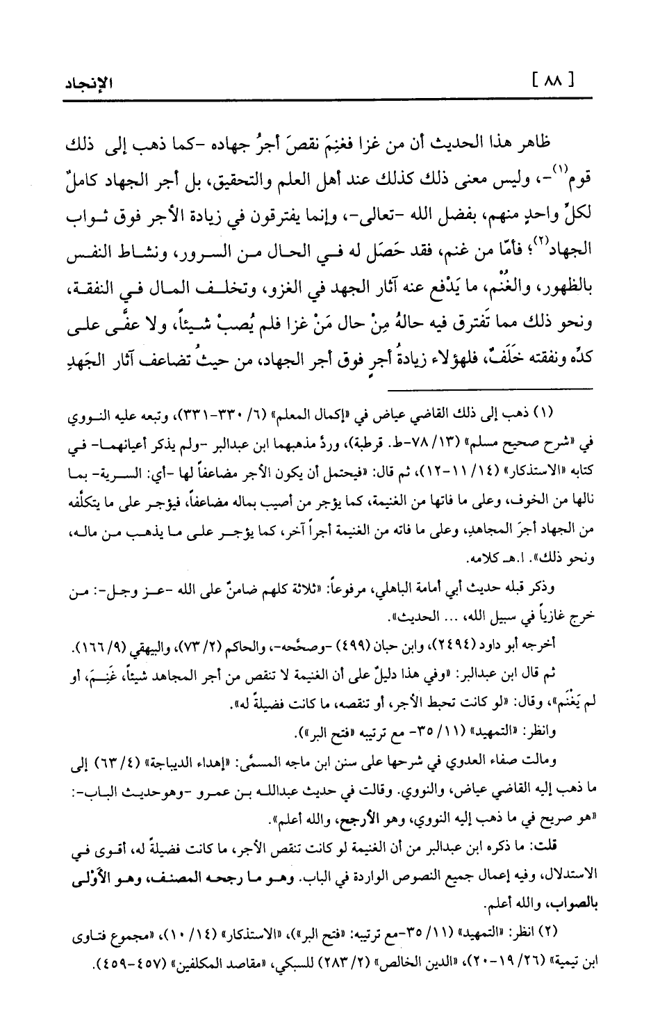 (¬1) ذهب إلى ذلك القاضي عياض في «إكمال المعلم» (6/330-331) ، وتبعه عليه النووي في «شرح صحيح مسلم» (13/78-ط. قرطبة) ، وردَّ مذهبهما ابن عبد البر -ولم يذكر أعيانهما- في كتابه «الاستذكار» (14/11-12) ، ثم قال: «فيحتمل أن يكون الأجر مضاعفاً لها -أي: السرية- بما نالها من الخوف، وعلى ما فاتها من الغنيمة، كما يؤجر من أصيب بماله مضاعفاً، فيؤجر على ما يتكلَّفه من الجهاد أجرَ المجاهدِ، وعلى ما فاته من الغنيمة أجراً آخر، كما يؤجر على ما يذهب من ماله، ونحو ذلك» . ا. هـ كلامه.