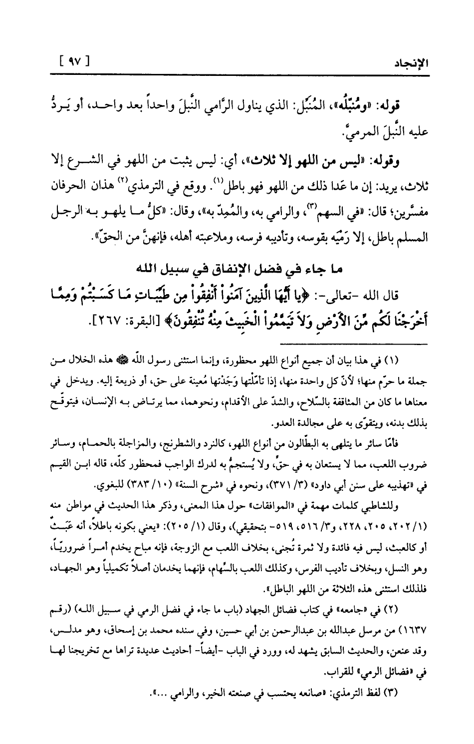 مفسَّرين؛ قال: «في السهم (¬3) ، والرامي به، والمُمِدّ به» ، وقال: «كلُّ ما يلهو به الرجل المسلم باطل، إلا رَمْيَه بقوسه، وتأديبه فرسه، وملاعبته أهله، فإنهنَّ من الحقّ» .