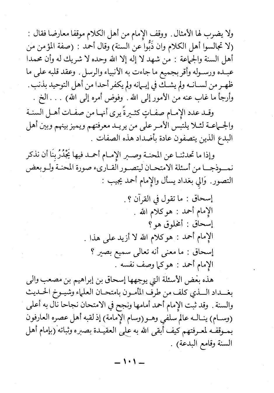 هذه بعض الأسئلة التي يوجهها إسحاق بن إبراهيم بن مصعب والي بغداد الذي كلف من طرف المأمون بامتحان العلماء وشيوخ الحديث والسنة، وقد ثبت الإمام أحمد أمامها ونجح في الامتحان نجاحاً نال به أعلى (وسام) يناله عالم سلفي وهو (وسام الإمامة) إذ لقبه أهل عصره العارفون بموقفه لمعرفتهم كيف أبقى الله بع على العقيدة بصبره وثباته (بإمام أهل السنة وقامع البدعة) .