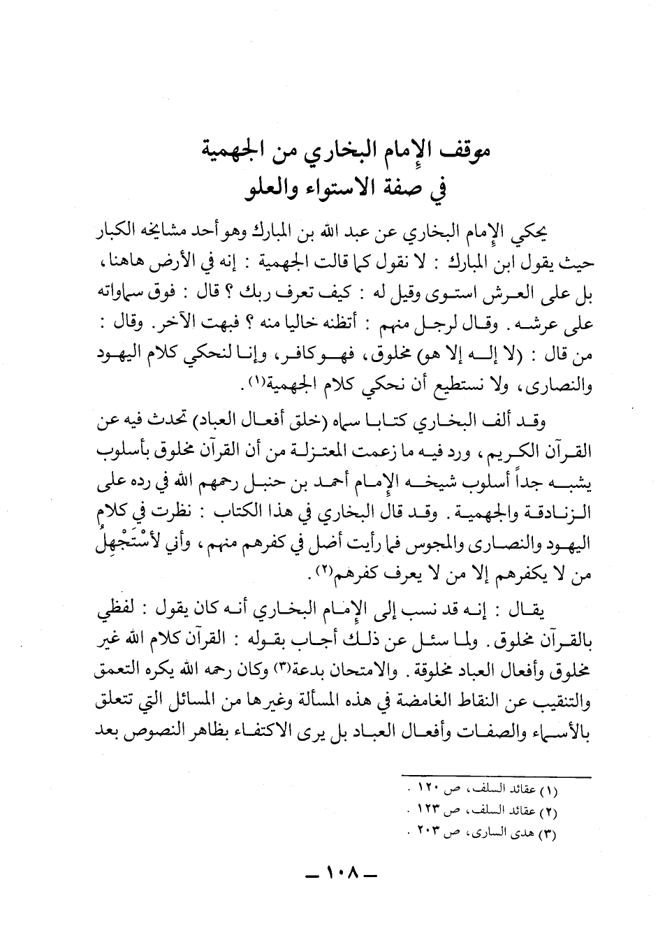 يحكي البخاري عن عبد الله بن المبارك، وهو أحد مشايخه الكبار حيث يقول ابن المبارك: لا نقول كما قالت الجهمية: إنه في الأرض هاهنا، بل على العرش استوى، وقيل له: كيف تعرف ربك؟ قال: فوق سماواته على عرشه، وقال لرجل منهم: أتظنه خالياً منه؟ فبهت الآخر. وقال من قال: (لا إله إلا هو) مخلوق، فهو كافر، وإنا لنحكي كلام اليهود والنصارى، ولا نستطيع أن نحكي كلام الجهمية1.