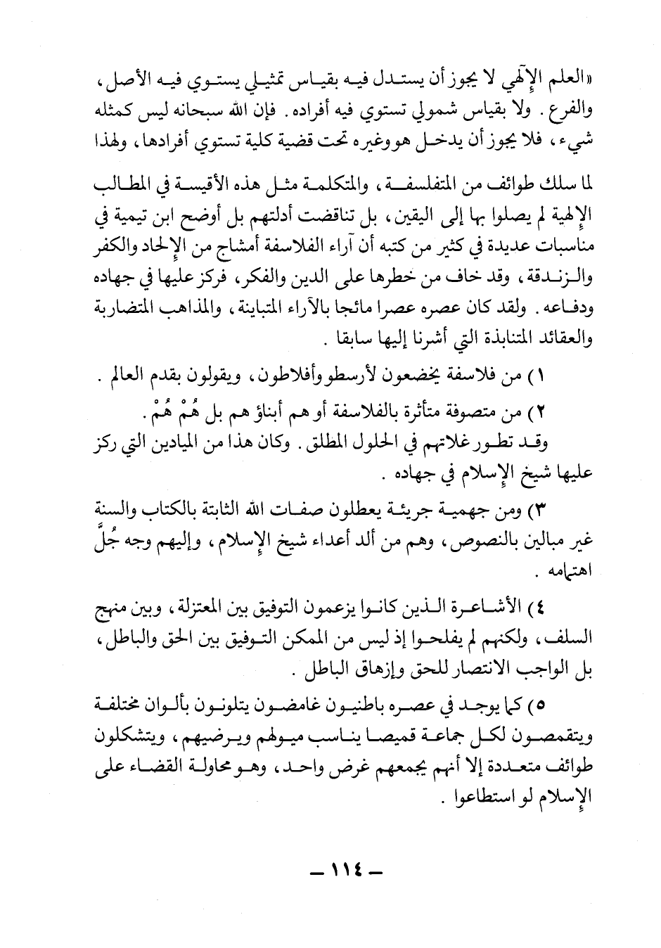 "العلم الإلهي لا يجوز أن يستدل فيه بقياس تمثيلي يستوي فيه الأصل، والفرع. ولا بقياس شمولي تستوي فيه أفراده. فإن الله سبحانه ليس كمثله شيء، فلا يجوز أن يدخل هو وغيره تحت قضية كلية تستوي أفرادها، ولهذا لما سلك طوائف من المتفلسفة، والمتكلمة مثل هذه الأقيسة في المطالب الإلهية لم يصلوا بها إلى اليقين، بل تناقضت أدلتهم بل أوضح ابن تيمية في مناسبات عديدة في كثير من كتبه أن آراء الفلاسفة أمشاج من الإلحاد والكفر والزندقة، وقد خاف من خطرها على الدين والفكر، فركز عليها في جهاده ودفاعه، ولقد كان عصره عصراً مائجاً بالآراء المتباينة، والمذاهب المتضاربة، والعقائد المتنابذة التي أشرنا إليها سابقاً.