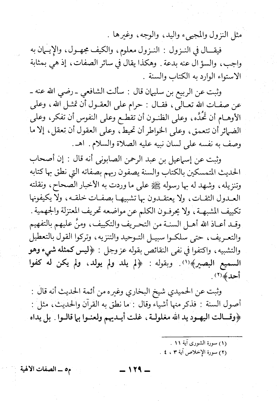 وقد أعاذ الله أهل السنة من التحريف والتكييف، ومنّ عليهم بالتفهيم والتعريف، حتى سلكوا سبيل التوحيد والتنزيه، وتركوا القول بالتعطيل والتشبيه، واكتفوا في نفي النقائص بقوله عز وجل: {لَيْسَ كَمِثْلِهِ شَيْءٌ وَهُوَ السَّمِيعُ البَصِيرُ} 1، وبقوله: {لَمْ يَلِدْ وَلَمْ يُولَدْ وَلَمْ يَكُن لَّهُ كُفُوًا أَحَدٌ} 2.