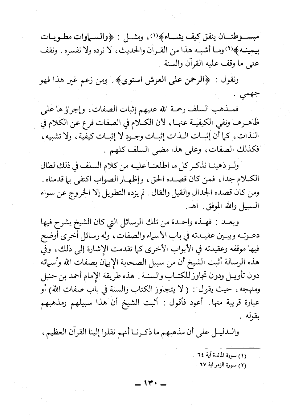 وبعد: فهذه واحدة من تلك الرسائل التي كان الشيخ يشرح فيها دعوته ويبين عقيدته في باب الأسماء والصفات، وله رسائل أخرى أوضح فيها موقفه وعقيدته في الأبواب الأخرى، كما تقدمت الإشارة إلى ذلك، وفي هذه الرسالة أثبت الشيخ أن من سبيل الصحابة الإيمان بصفات الله وأسمائه دون تأويل ودون تجاوز للكتاب والسنة. هذه طريقة الإمام أحمد بن حنبل ومنهجه، حيث يقول: "لا يتجاوز الكتاب والسنة في باب صفات الله" أو عبارة قريبة منها. أعود فأقول: أثبت الشيخ أن هذا سبيلهم ومذهبهم بقوله: