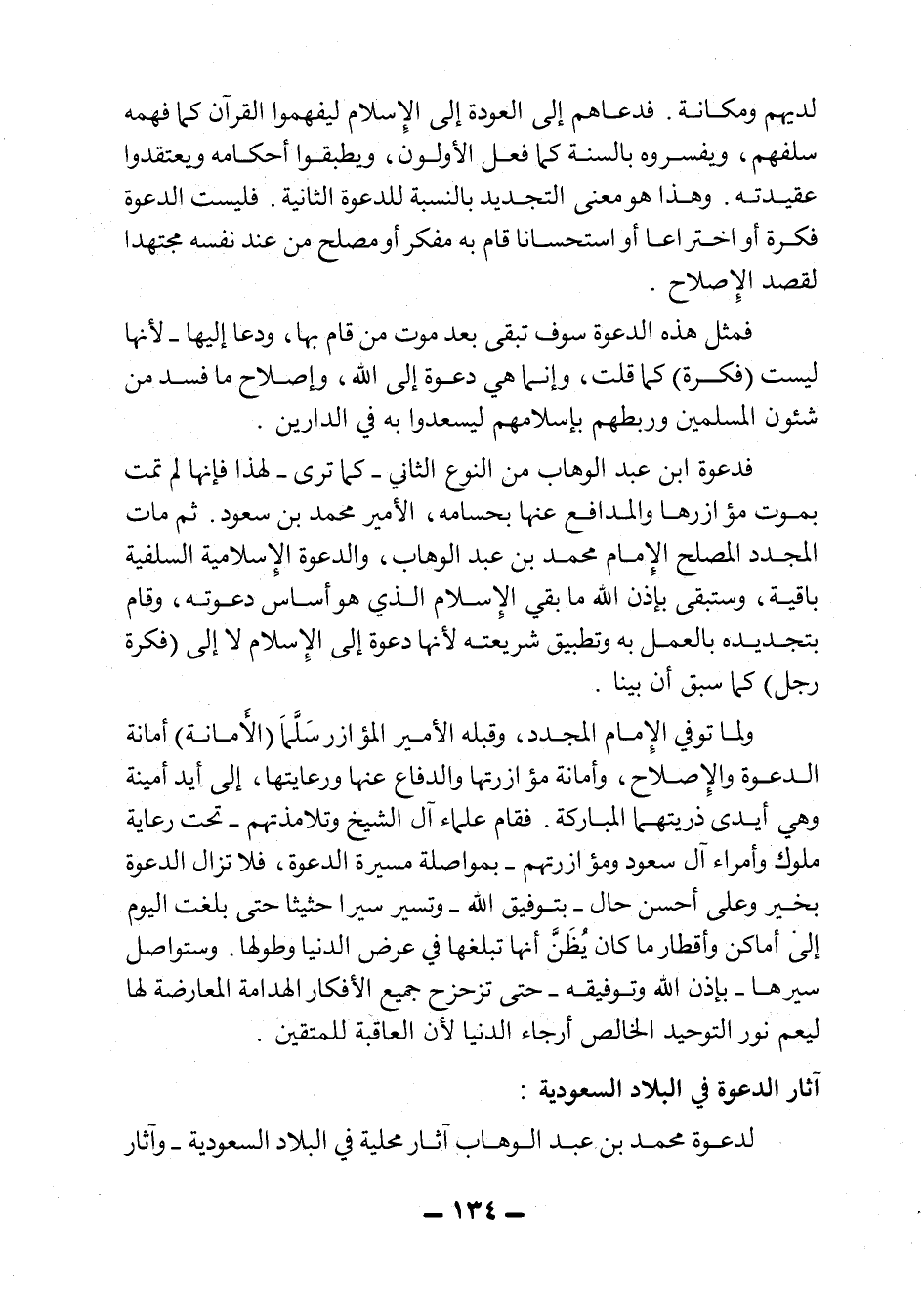 فدعوة ابن عبد الوهاب من النوع الثاني - كما ترى- لهذا فإنها لم تمت بموت مؤازرها، والمدافع عنها بحسامه، الأمير محمد بن سعود، ثم مات المجدد المصلح الإمام محمد بن عبد الوهاب والدعوة الإسلامية السلفية باقية، وستبقى بإذن الله ما بقي الإسلام الذي هو أساس دعوته، وقام بتجديده بالعمل به وتطبيق شريعته لأنها دعوة إلى الإسلام لا إلى (فكرة رجل) كما سبق أن بينا.