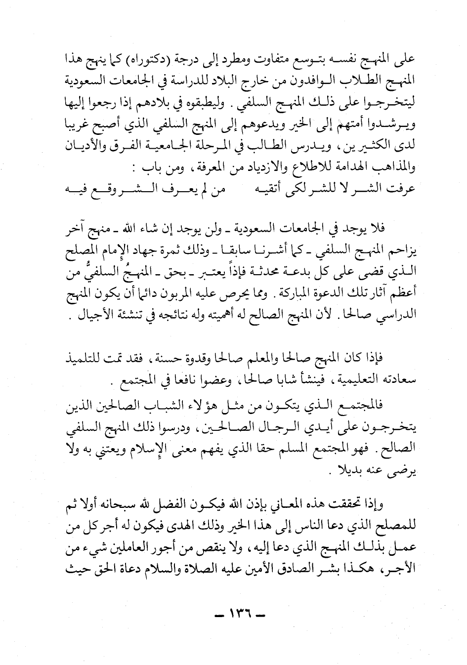 على المنهج نفسه بتوسع متفاوت ومطرد إلى درجه (دكتوراه) كما ينهج هذا المنهج الطلاب الوافدون من خارج البلاد للدراسة في الجامعات السعودية، ليتخرجوا على ذلك المنهج السلفي، وليطبقوه في بلادهم إذا رجعوا إليها ويرشدوا أمتهم إلى الخير، ويدعوهم إلى المنهج السلفي الذي أصبح غريباً لدى الكثيرين، ويدرس الطالب في المرحلة الجامعية الفرق والأديات والمذاهب الهدامة للاطلاع والازدياد من المعرفة، ومن باب: