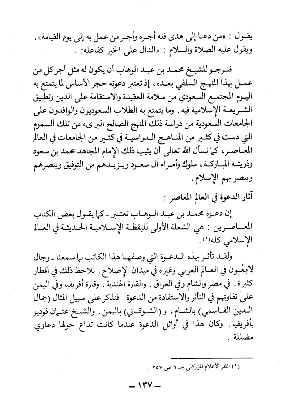 فنرجو للشيخ محمد بن عبد الوهاب أن يكون له مثل أجر كل من عمل بهذا المنهج السلفي بعده، إذ تعتبر دعوته حجر الأساس لما يتمتع به اليوم المجتمع السعودي من سلامة العقيدة والاستقامة على الدين وتطبيق الشريعة الإسلامية فيه، وما يتمتع به الطلاب السعوديون والوافدون على الجامعات السعودية من دراسة ذلك المنهج الصالح البريء من تلك السموم التي دست في كثير من المناهج الدراسية في كثير من الجامعات في العالم المعاصر، كما نسأل الله تعالى أن يثيب ذلك الإمام المجاهد محمد بن سعود وذريته المباركة، ملوك وأمراء آل سعود ويزيدهم من التوفيق وينصرهم وينصر بهم الإسلام.
