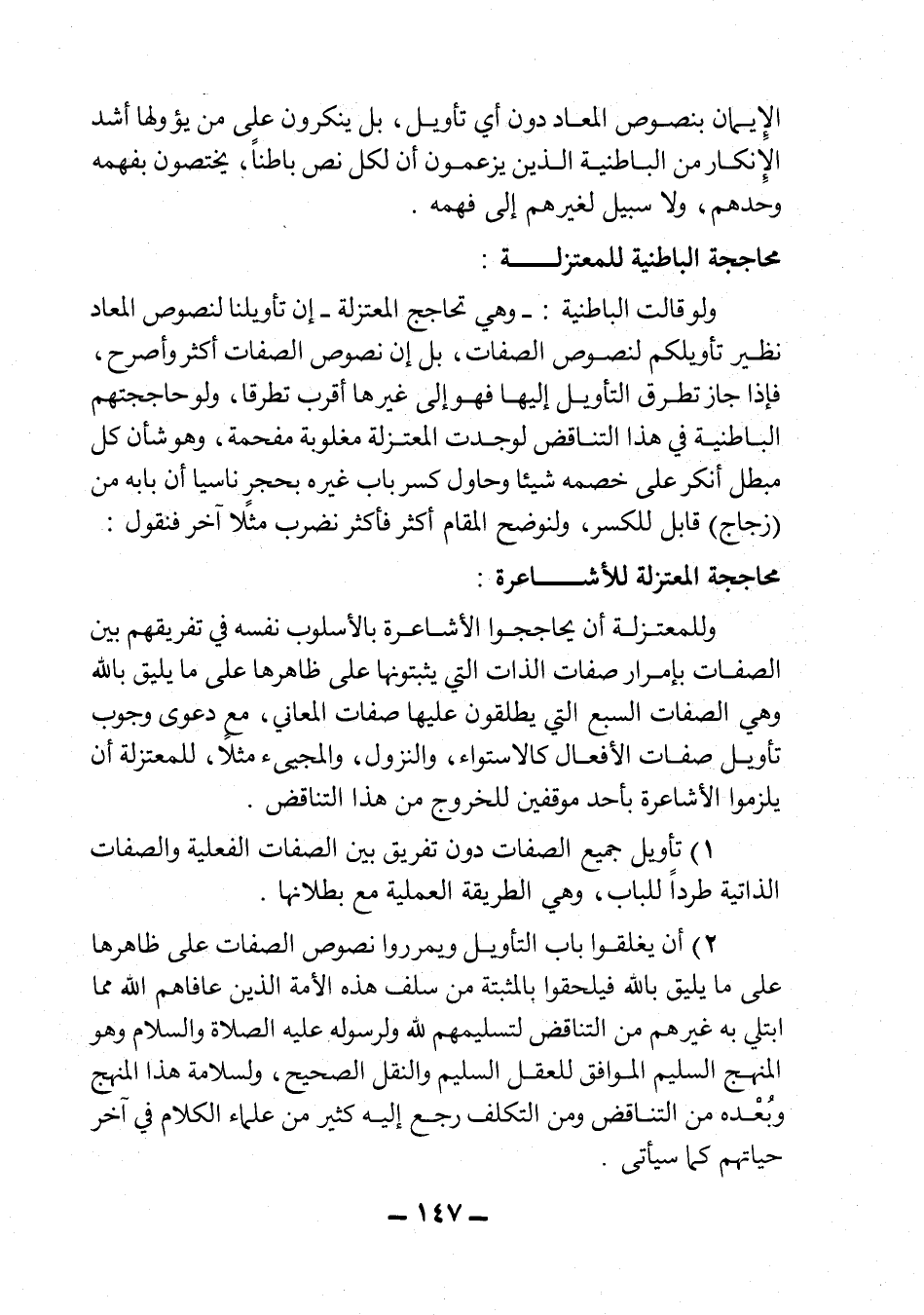 ولو قالت الباطنية: - وهي تحاجج المعتزلة - إن تأويلنا لنصوص المعاد نظير تأويلكم لنصوص الصفات، بل إن نصوص الصفات أكثر وأصرح، فإذا جاز تطرق التأويل إليها فهو إلي غيرها أقرب تطرقاً، ولو حاججتهم الباطنية في هذا التناقض لوجدت المعتزلة مغلوبة مفحمة، وهو شأن كل مبطل أنكر على خصمه شيئاً، وحاول كسر باب غيره بحجر ناسياً أن باببه من (زجاج) قابل للكسر، ولنوضح المقام أكثر فأكثر نضرب مثلاً آخر فنقول: