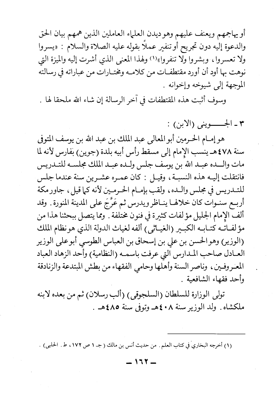 أو يهاجمهم ويعنف عليهم وهو ديدن العلماء العاملين الذين همهم بيان الحق والدعوة إليه دون تجريح أو تنفير عملاً بقوله عليه الصلاة والسلام: "يسروا ولا تعسروا وبشروا ولا تنفروا"1، ولهذا المعنى الذي أشرت إليه والميزة التي نوهت بها أود أن أورد مقتطفات من كلامه ومختارات من عباراته في رسالته الموجهة إلى شيوخه وإخوانه.