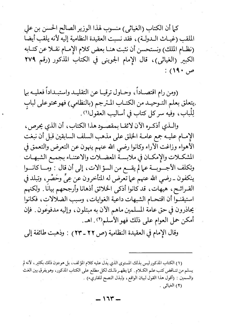 كما أن الكتاب (الغياثي) منسوب لهذا الوزير الصالح الحسن بن علي الملقب (غياث الدولة) ، فقد نسبت العقيدة النظامية إليه، لأنه يلقب أيضاً (نظام الملك) ونستحسن أن نثبت هنا بعض كلام الإمام نقلاً عن كتابه الكبير (الغياثي) ، قال الإمام الجويني في الكتاب المذكور (رقم 279 ص190) :