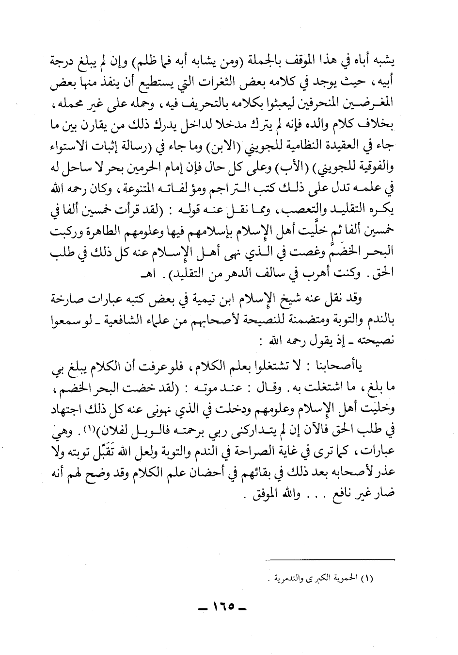 وهي عبارات، كما ترى في غاية الصراحة في الندم والتوبة ولعل الله تقبل توبته ولا عذر لأصحابه بعد ذلك في بقائهم في أحضان علم الكلام وقد وضح لهم أنه ضار غير نافع ... والله الموفق.