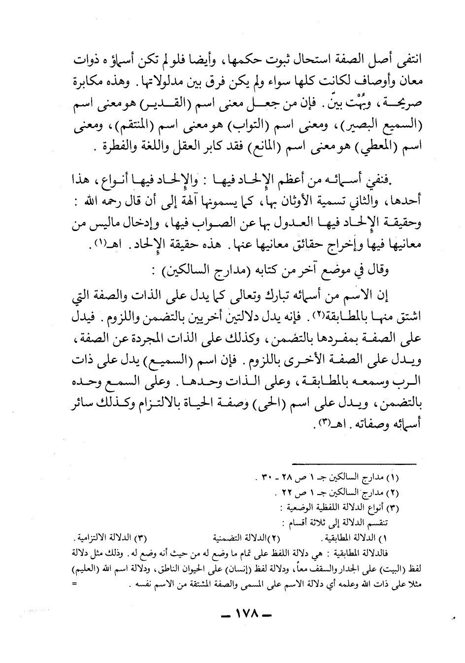 "إن الاسم من أسمائه تبارك وتعالى، كما يدل على الذات والصفة التي اشتق منها بالمطابقة2، فإنه يدل دلالتين أخريين بالتضمن واللزوم. فيدل على الصفة بمفردها بالتضمن، وكذلك على الذات المجردة عن الصفة، ويدل على الصفة الأخرى باللزوم. فإن اسم (السميع) يدل على ذات الرب وسمعه بالمطابقة، وعلى الذات وحدها، وعلى السمع وحده بالتضمن، ويدل على اسم (الحي) وصفة الحياة بالالتزام وكذلك سائر أسمائه وصفاته3 اهـ.