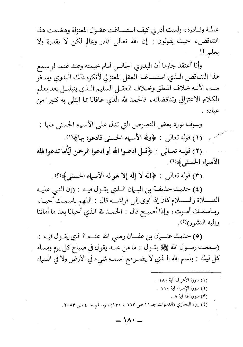 وأنا أعتقد جازماً أن البدوي الجالس أمام خيمته وعند غنمه لو سمع هذا التناقض الذي استساغه العقل المعتزلي، لأنكره ذلك البدوي وسخر منه، لأنه خلاف المنطق، وخلاف العقل السليم الذي يتبلبل بعد بعلم الكلام الاعتزالي وتناقضاته، فالحمد لله الذي عافانا مما ابتلى به كثيراً من عباده.