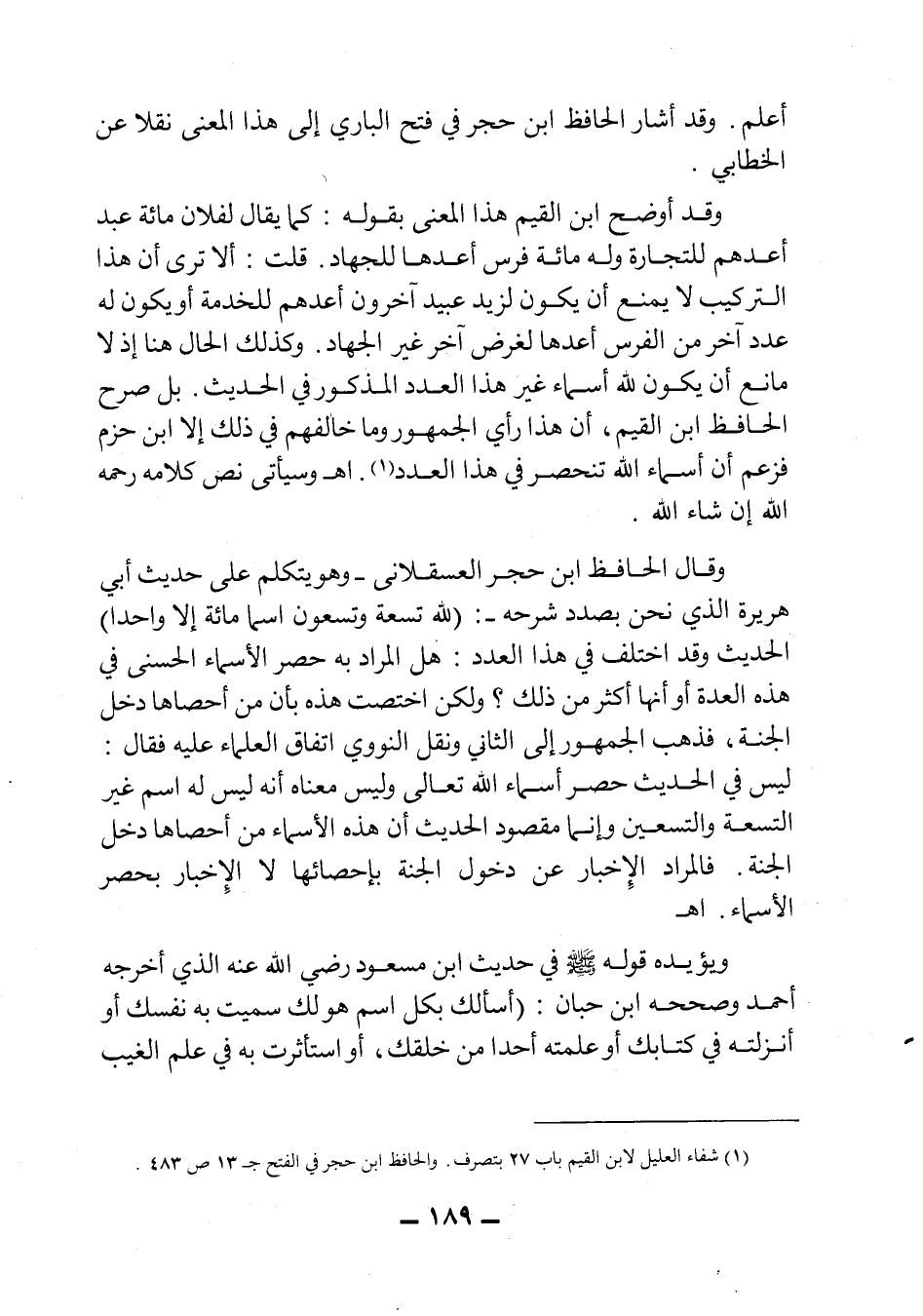 وكذلك الحال هنا إذ لا مانع أن يكون لله أسماء غير هذا العدد المذكور في الحديث". بل صرح الحافظ ابن القيم أن هذا رأي الجمهور وما خالفهم في ذلك إلا ابن حزم فزعم أن أسماء الله تنحصر في هذا العدد1 اهـ. وسيأتي نص كلامه رحمه الله إن شاء الله.