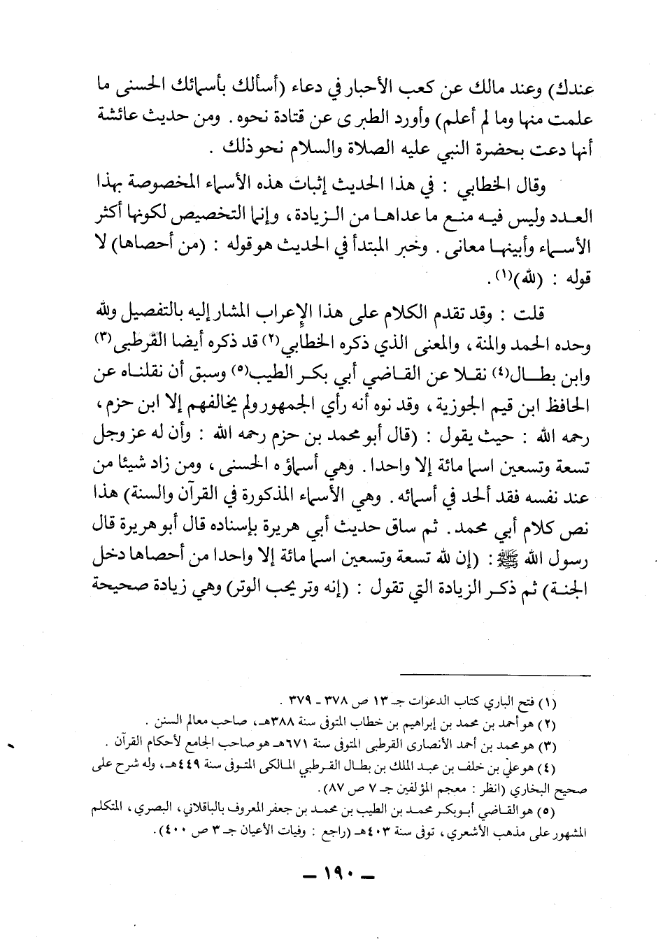 قلت: وقد تقدم الكلام على هذت الإعراب المشار إليه بالتفصيل، ولله وحده الحمد والمنة، والمعنى الذي ذكره الخطابي2 قد ذكره أيضاً القرطبي3 وابن بطال4 نقلاً عن القاضي أبي بكر الطيب5 وسبق أن نقلناه عن الحافظ ابن قيم الجوزية، وقد نوه أنه رأي الجمهور ولم يخالفهم إلا ابن حزم، رحمه الله: حيث يقول: "قال أبو محمد بن حزم رحمه الله: وأن له عز وجل تسعة وتسعن اسماً مائة إلا واحداً، وهي أسماؤه الحسنى، ومن زاد شيئاً من عند نفسه فقد ألحد في أسمائه. وهي الأسماء المذكورة في القرآن والسنة" هذا نص كلام أبي محمد. ثم ساق حديث أبي هريرة بإسناده، قال أبو هريرة قال رسول الله صلى الله عليه وسلم: "إن لله تسعة وتسعين اسماً مائة ألا واحداً، من أحصاها دخل الجنة"، ثم ذكر الزيادة التي يقول: " إنه وتر يحب الوتر "، وهي زيادة صحيحة