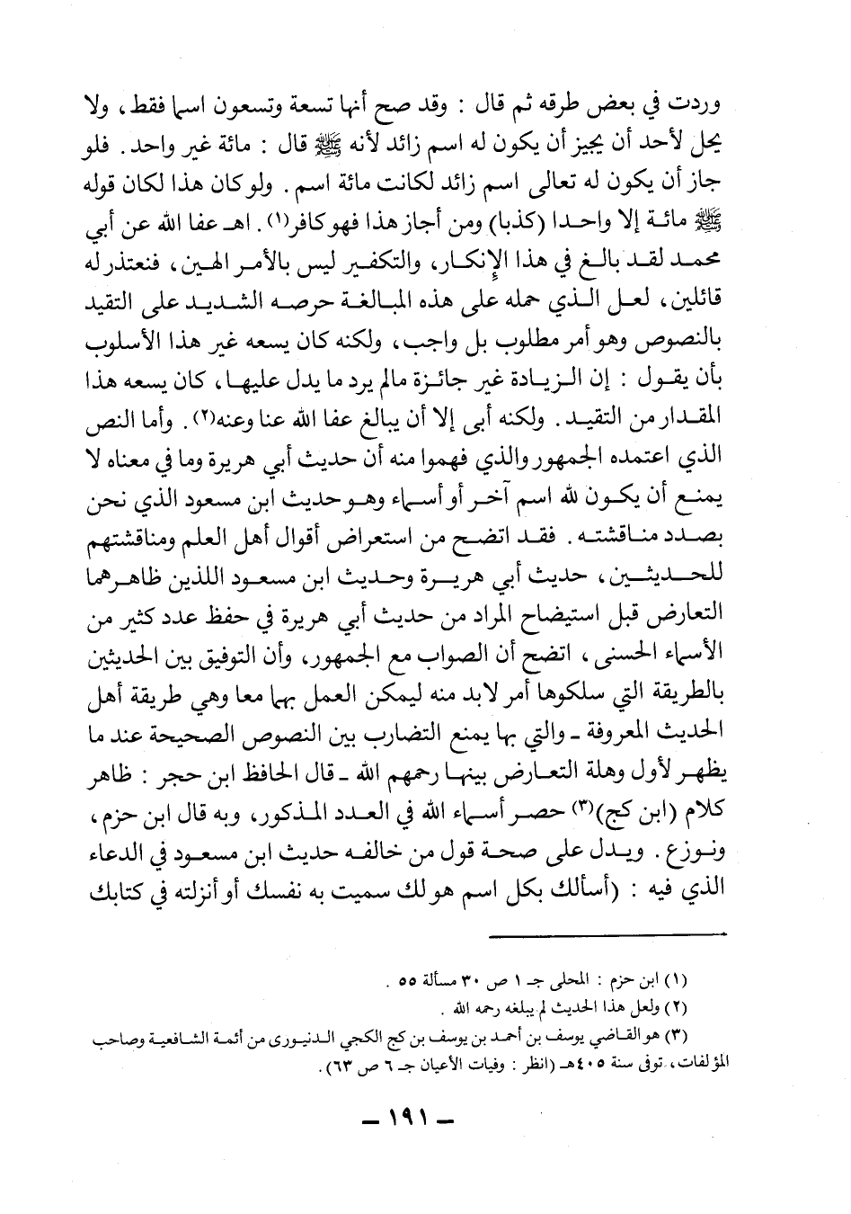 قال الحافظ ابن حجر: ظاهر كلام (ابن كج) 3 حصر أسماء الله في العدد المذكور، وبه قال ابن حزم، ونوزع. ويدل على صحة قول من خالفه حديث ابن مسعود في الدعاء الذي فيه: " أسألك بكل اسم هو لك، سميت به نفسك، أو أنزلته في كتابك،
