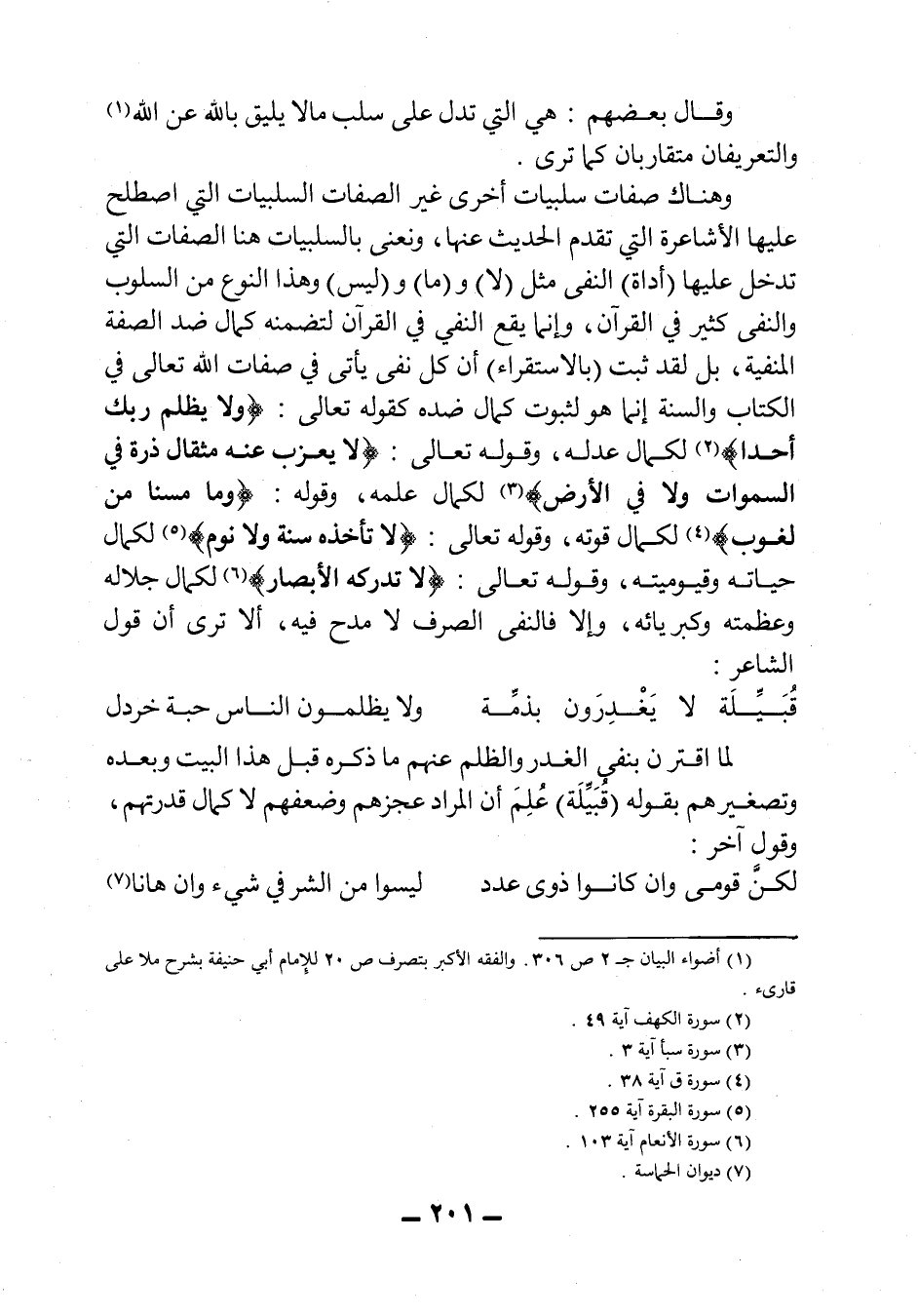 وهناك صفات سلبيات أخرى غير الصفات السلبيات التي اصطلح عليها الأشاعرة التي تقدم الحديث عنها، ونعني بالسلبيات هنا الصفات التي تدخل عليها (أداة) النفي مثل (لا) ، و (ما) و (ليس) وهذا النوع من السلوب والنفي كثير في القرآن، وإنما يقع النفي في القرآن لتضمنه كمال ضد الصفة المنفية، بل لقد ثبت (بالاستقراء) أن كل نفي يأتي في صفات الله تعالى في الكتاب والسنة إنما هو لثبوت كمال ضده، كقوله تعالى: {وَلاَ يَظْلِمُ رَبُّكَ أَحَدًا} 2، لكمال عدله، وقوله تعالى: {لاَ يَعْزُبُ عَنْهُ مِثْقَالُ ذَرَّةٍ فِي السَّمَاوَاتِ وَلاَ فِي الأَرْضِ} 3، لكمال علمه، وقوله: {وَمَا مَسَّنَا مِن لُّغُوبٍ} 4، لكمال قوته، وقوله تعالى: {لاَ تَأْخُذُهُ سِنَةٌ وَلاَ نَوْمٌ} 5، لكمال حياته وقيوميته، وقوله تعالى: {لاَّ تُدْرِكُهُ الأَبْصَارُ} 6، لكمال جلاله وعظمته وكبريائه، وإلا فالنفي الصرف لا مدح فيه، ألا ترى أن قول الشاعر: