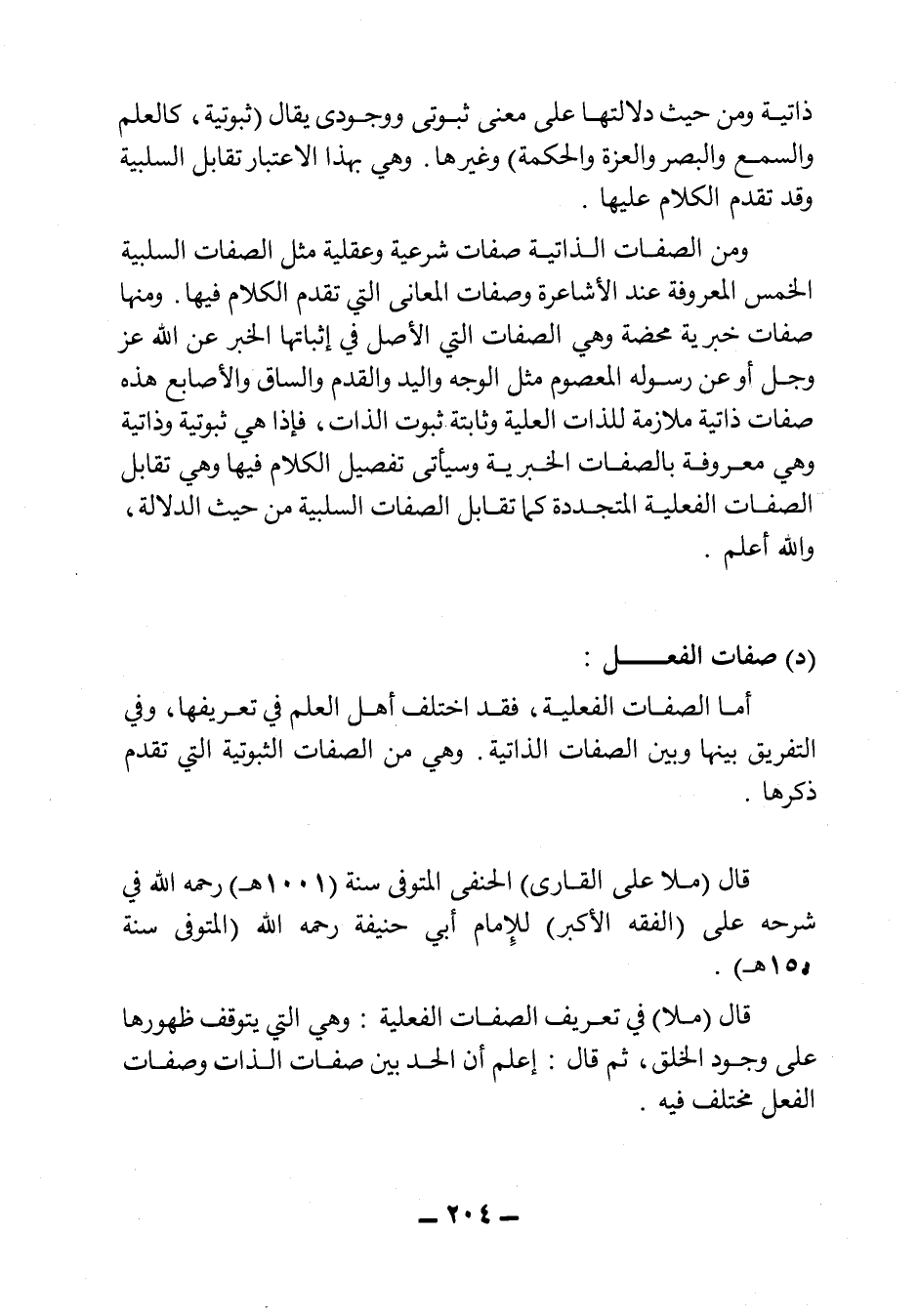 ومن الصفات الذاتية صفات شرعية وعقلية مثل الصفات السلبية الخمس المعروفة عند الأشاعرة وصفات المعاني التي تقدم الكلام فيها، ومنها صفات خبرية محضة وهي الصفات التي الأصل في إثباتها الخبر عن الله عز وجل أو عن رسوله المعصوم مثل الوجه واليد والقدم والساق والأصابع هذه صفات ذاتية ملازمة للذات العلية وثابتة ثبوت الذات، فإذا هي ثبوتية وذاتية وهي معروفة بالصفات الخبرية، وسيأتي تفصيل الكلام فيها وهي تقابل الصفات الفعلية المتجددة كما تقابل الصفات السلبية من حيث الدلالة، والله أعلم.