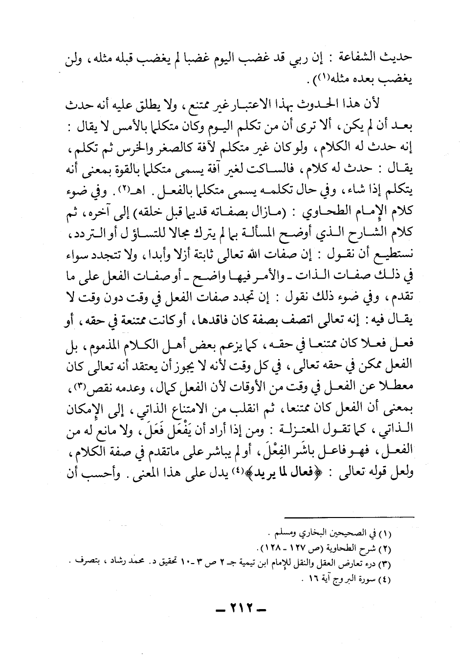 وفي ضوء كلام الإمام الطحاوي: "ما زال بصفاته قديماً قبل خلقه" إلى آخره، ثم كلام الشارح الذي أوضح المسألة بما لم يترك مجالاً للتساؤل أو التردد، نستطيع أن نقول: إن صفات الله تعالى ثابتة أزلاً وأبداً، ولا تتجدد سواء في ذلك صفات الذات – والأمر فيها واضح- أو صفات الفعل على ما تقدم، وفي ضوء ذلك نقول: إن تجدد صفات الفعل في وقت دون وقت لا يقال فيه: إنه تعالى اتصف بصفة كان فاقدها، أو كانت ممتنعة في حقه، أو فعل فعلاً كان ممتنعاً في حقه، كما يزعم بعض أهل الكلام المذموم، بل الفعل ممكن في حقه تعالى، في كل وقت لأنه لا يجوز أن يعتقد أنه تعالى كان معطلاً عن الفعل في وقت من الأوقات، لأن الفعل كمال، وعدمه نقص3، بمعنى أن الفعل كان ممتنعاً، ثم انقلب من الامتناع الذاتي، إلى الإمكان الذاتي، كما تقول المعتزلة: ومن إذا أراد أن يفعل فَعَلَ، ولا مانع له من الفعل، فهو فاعل باشَر الفِعْل، أو لم يباشر على ما تقدم في صفة الكلام، ولعل قوله تعالى: {فَعَّالٌ لِّمَا يُرِيدُ} 4 يدل على هذا المعنى. وأحسب أن