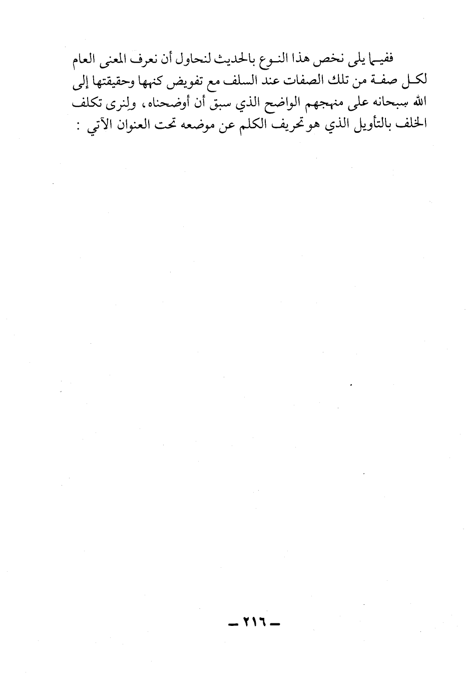 ففيما يلي نخص هذا النوع بالحديث لنحاول أن نعرف المعنى العام لكل صفة من تلك الصفات عند السلف مع تفويض كنهها وحقيقتها إلى الله سبحانه على منهجهم الواضح الذي سبق أن أوضحناه، ولنرى تكلف الخلف بالتأويل الذي هو تحريف الكلم عن موضعه تحت العنوان الآتي.